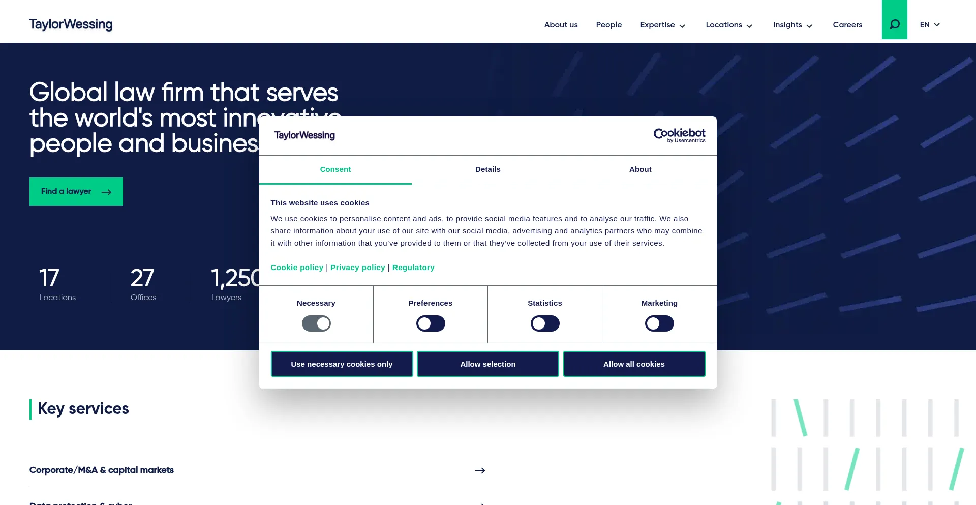 The website implements cookie consent mechanisms in compliance with privacy regulations such as GDPR or CCPA. This demonstrates that taylorwessing.com adheres to data protection standards and provides users with control over personal data collection practices.
