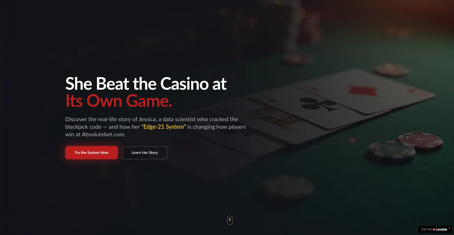 Discover Jessica's Edge-21 System - the blackjack strategy that uses AI pattern recognition and adaptive betting to give you the edge at Absolutebet.com. Get $25 free play.