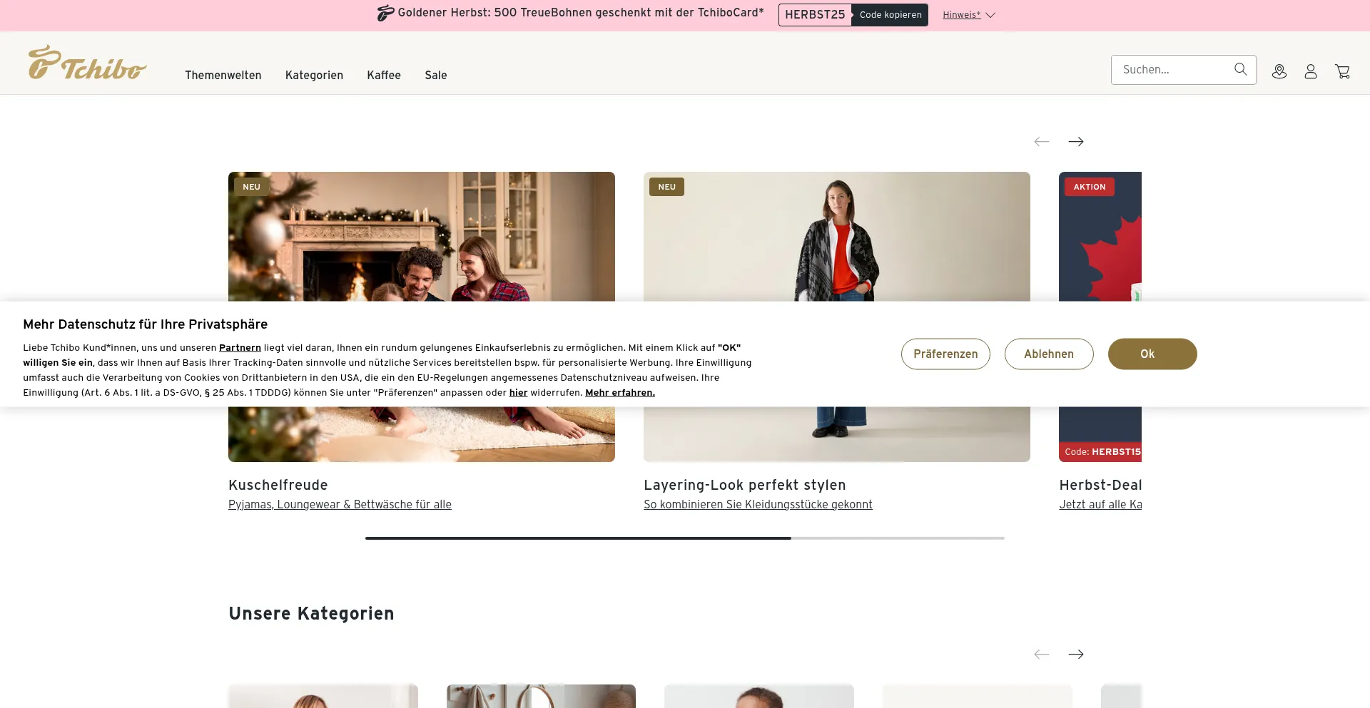 The website implements cookie consent mechanisms in compliance with privacy regulations such as GDPR or CCPA. This demonstrates that tchibo.de adheres to data protection standards and provides users with control over personal data collection practices.