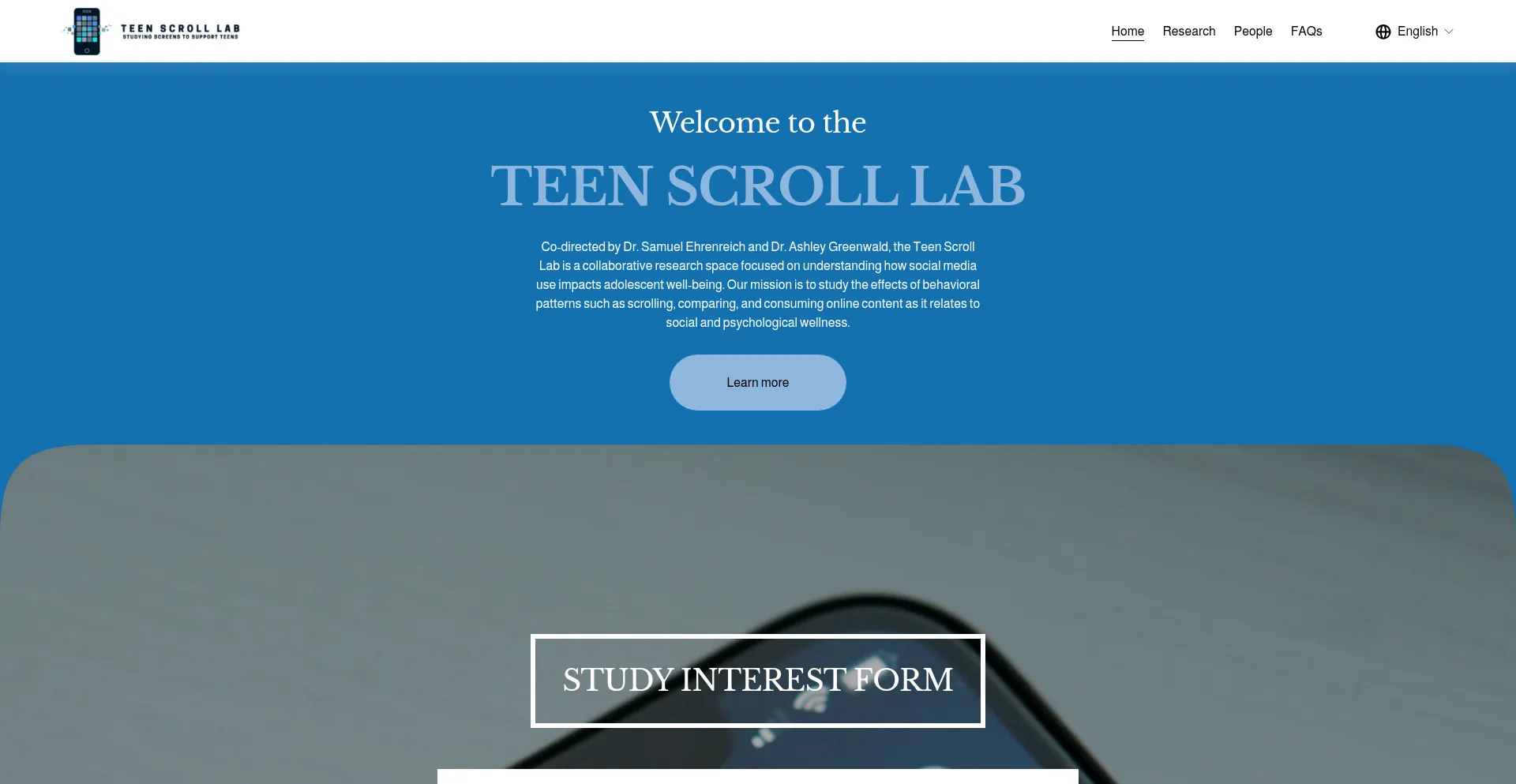 The teenscrolllab.com website uses Google Tag Manager to add and update tracking tags on its website.