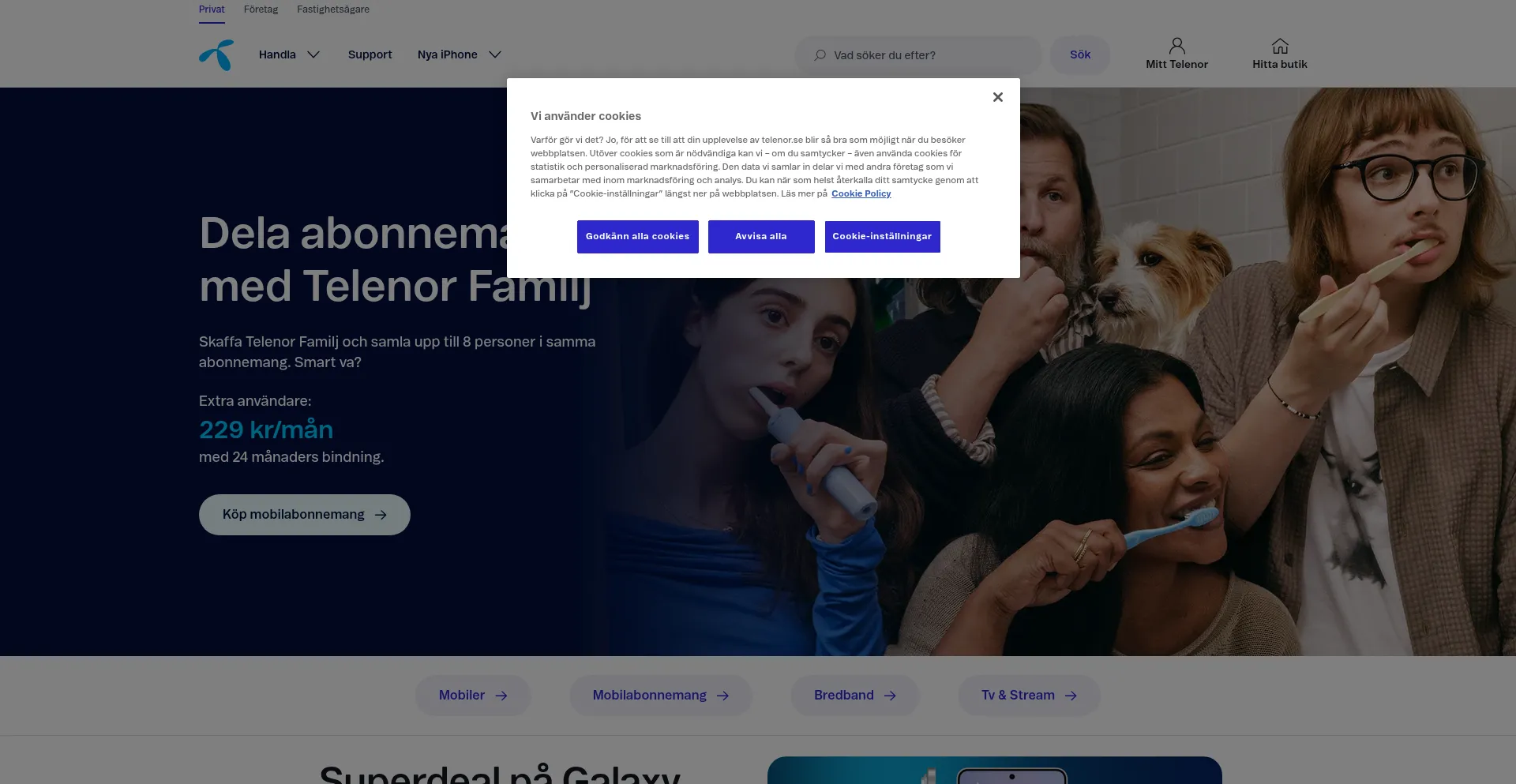 The website implements cookie consent mechanisms in compliance with privacy regulations such as GDPR or CCPA. This demonstrates that telenor.se adheres to data protection standards and provides users with control over personal data collection practices.