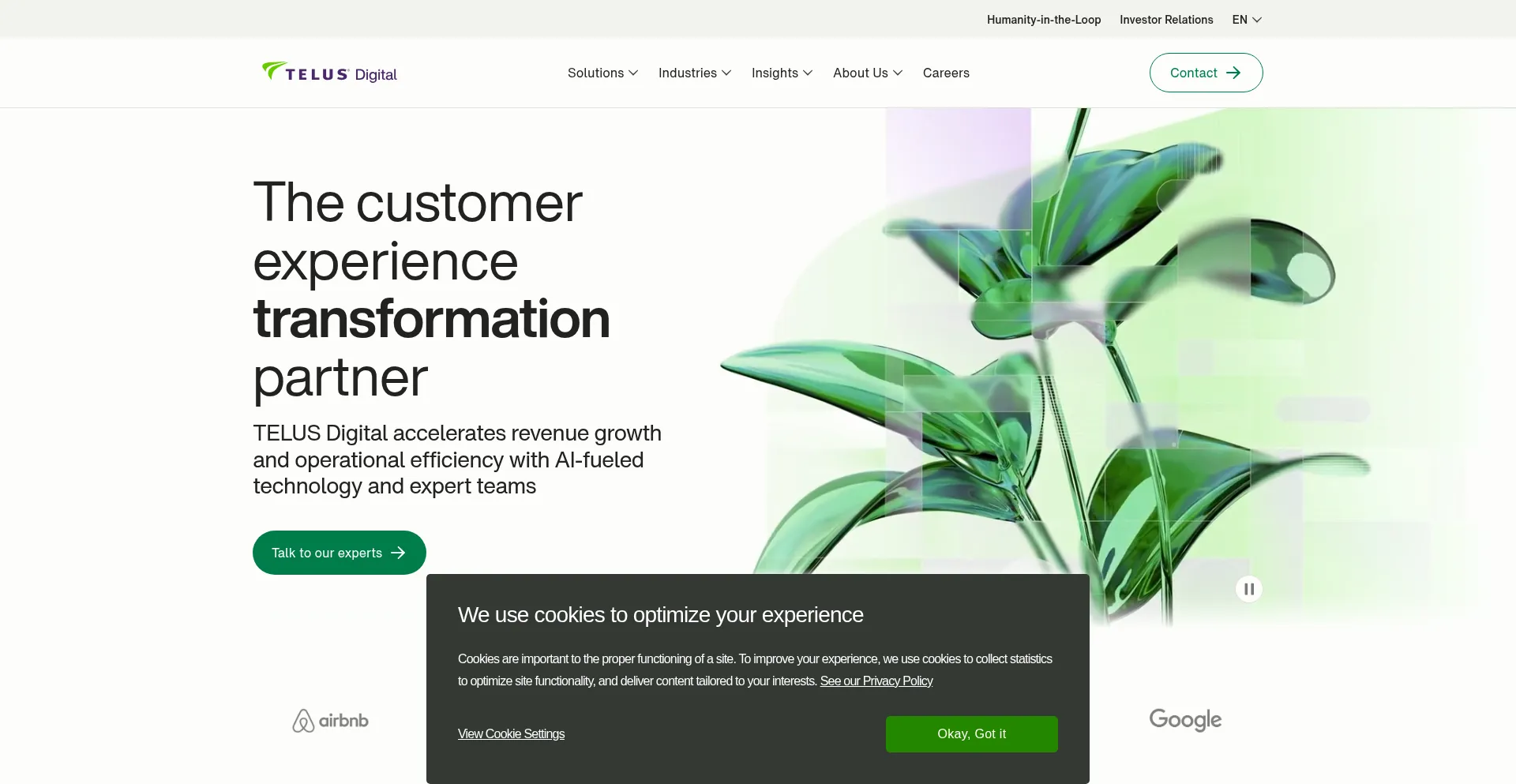 The website implements cookie consent mechanisms in compliance with privacy regulations such as GDPR or CCPA. This demonstrates that telusdigital.com adheres to data protection standards and provides users with control over personal data collection practices.