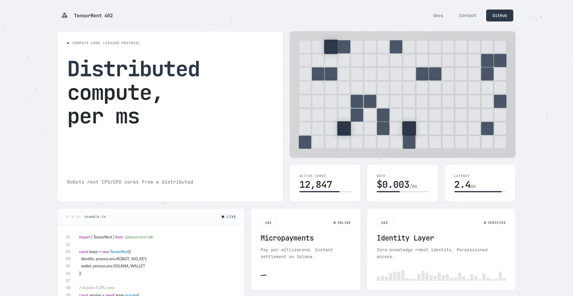 Distributed compute leasing with per-millisecond billing. Robots rent CPU/GPU cores and pay via HTTP 402 micropayments on Solana with 403 identity verification.