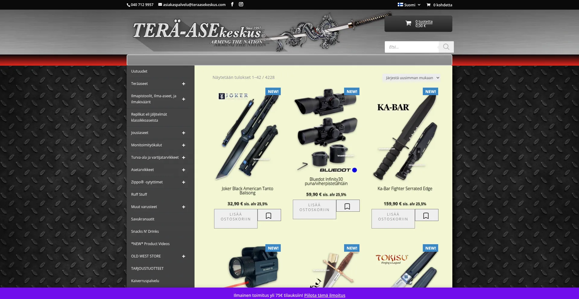 TERÄASEkeskus Ase- ja veitsikauppaan erikoistunut yritys. Meiltä löydä Miekat, Veitset, Puukot, Jousiaseet, Monitoimityökalut ja Tarvikkeet