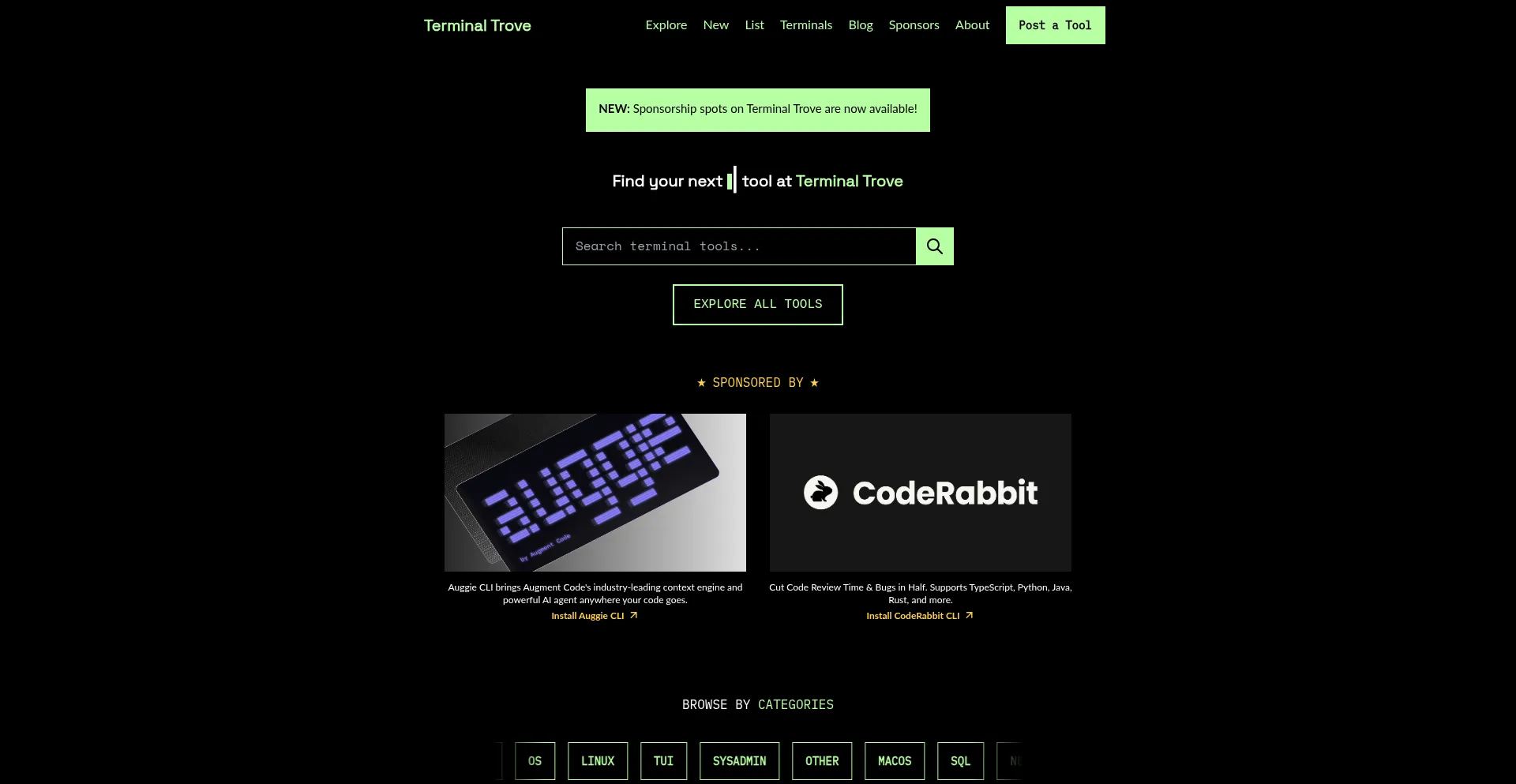 Terminal Trove showcases the best of the terminal, Discover a collection of CLI, TUI, and more developer tools at Terminal Trove.