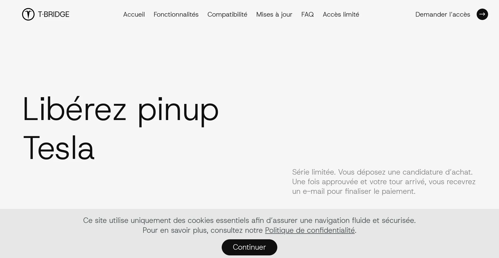 T-Bridge pour Tesla en série limitée. Candidature d’achat (999 €). Après approbation, vous recevrez un e-mail quand votre fenêtre d’achat s’ouvre.