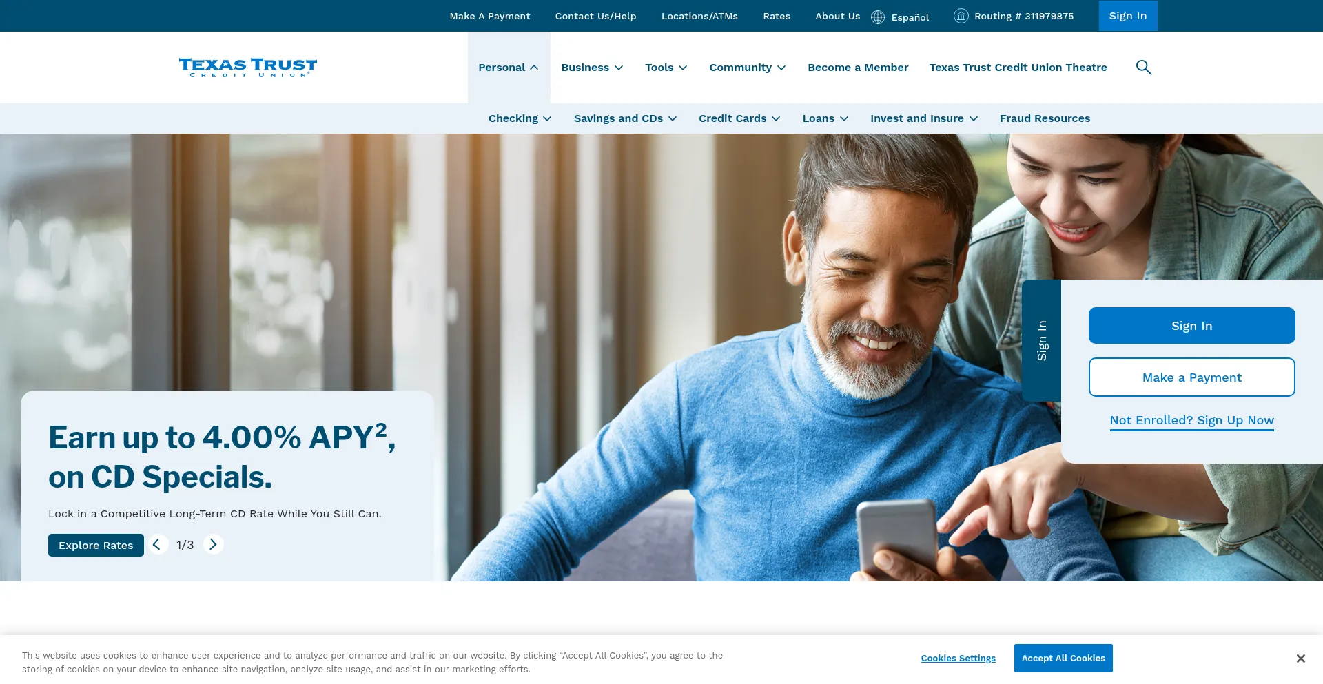 The website implements cookie consent mechanisms in compliance with privacy regulations such as GDPR or CCPA. This demonstrates that texastrustcu.org adheres to data protection standards and provides users with control over personal data collection practices.