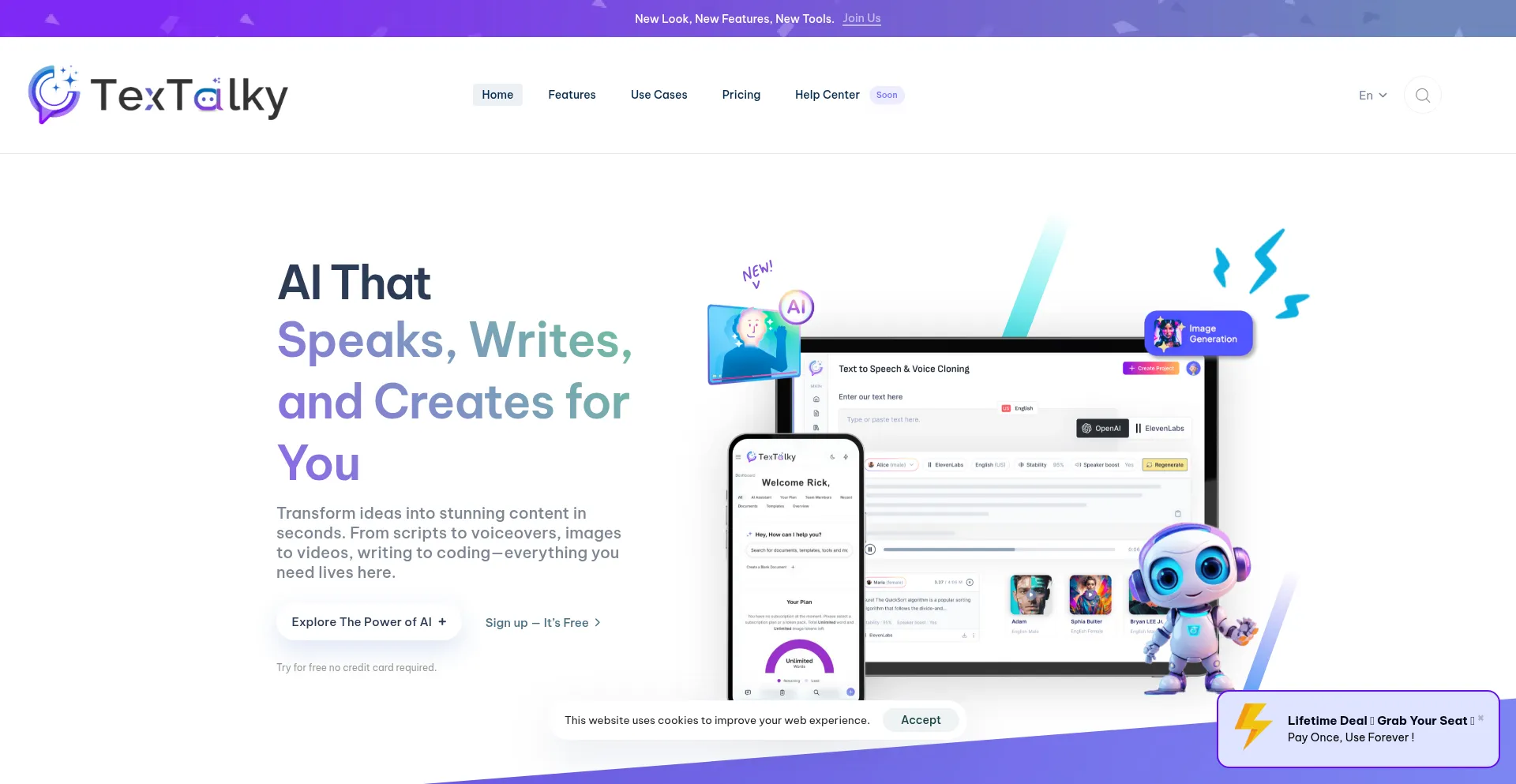 Quickly turn ideas into impressive content. Whether it's scripts, voiceovers, images, videos, writing, or coding—everything you need is right here.