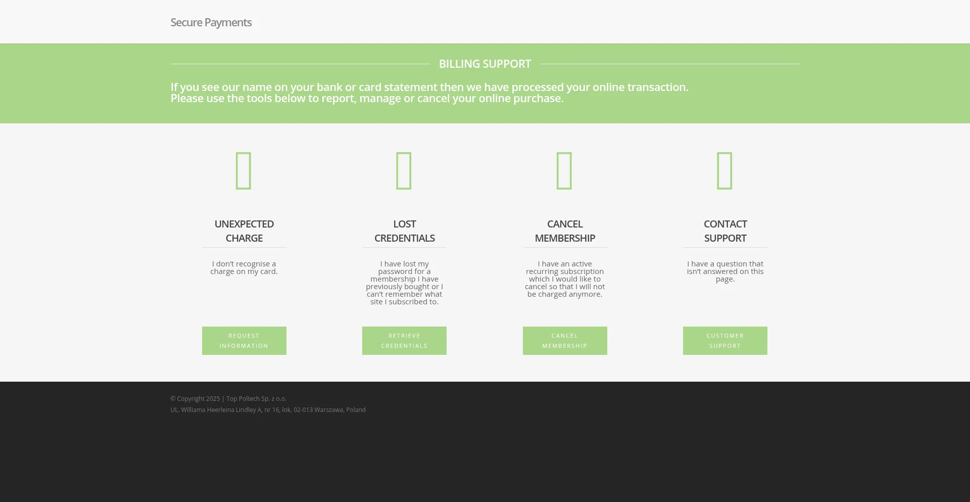 The website contains dedicated sections addressing payment disputes, subscription management, chargeback procedures, refund policies, and other financial transaction concerns, indicating established billing operations.