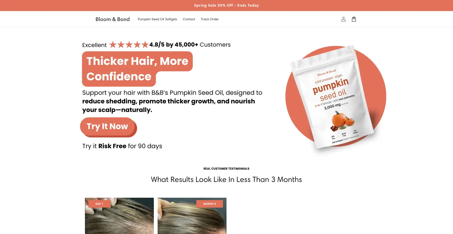 Bloom & Bond's premium Pumpkin Seed Oil supplement reduces excessive hair shedding at the source by naturally blocking DHT. Clinically shown to reduce hair loss and promote visi...