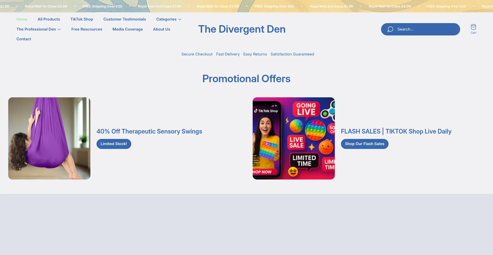 Analysis indicates that thedivergentden.co.uk operates as an e-commerce platform facilitating online transactions for goods or services. The website implements shopping cart functionality, payment processing systems, and product catalog features typical of commercial retail operations.