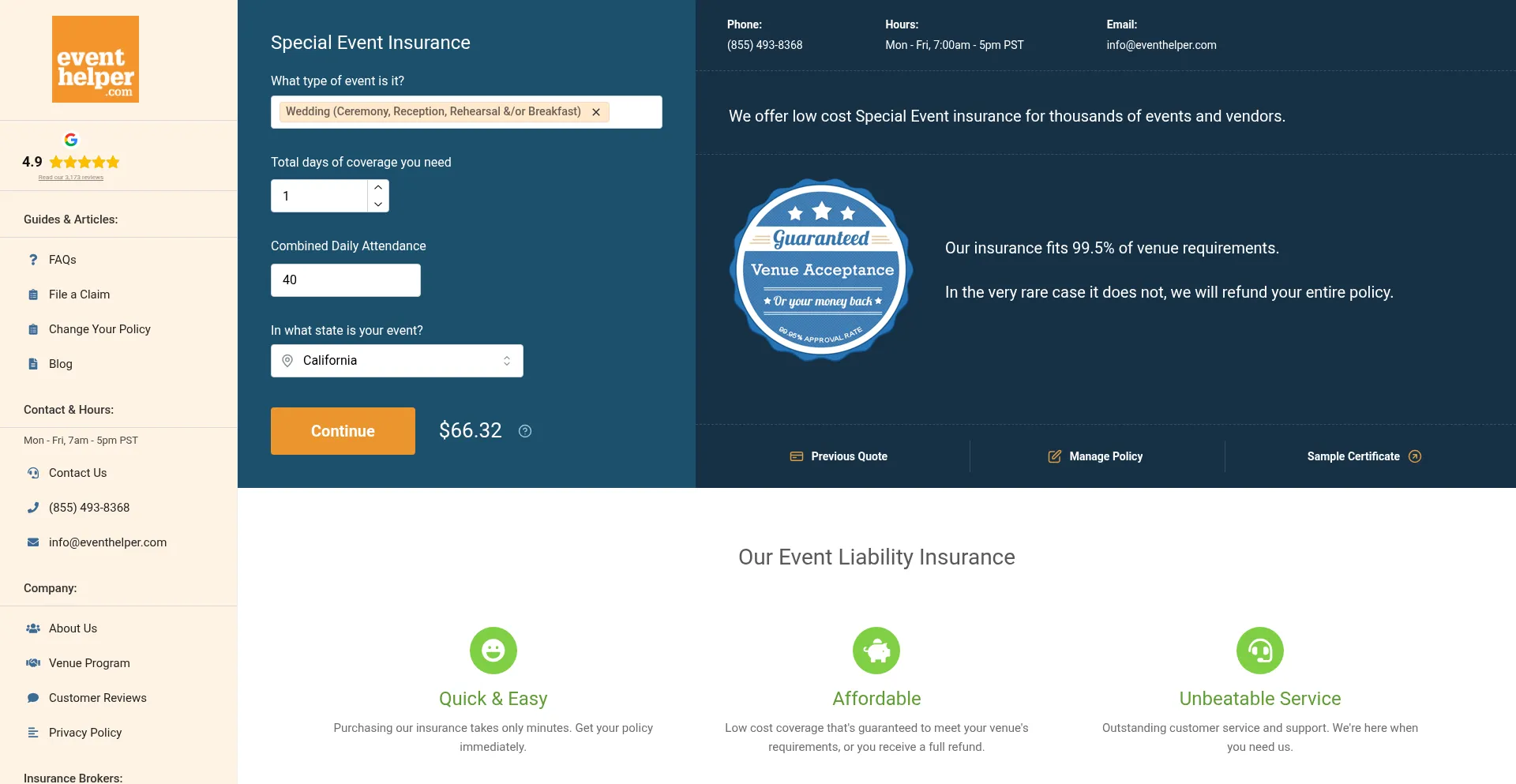 Low Cost Special Event insurance for thousands of events and vendors. Guaranteed to be accepted by your venue or your money back.