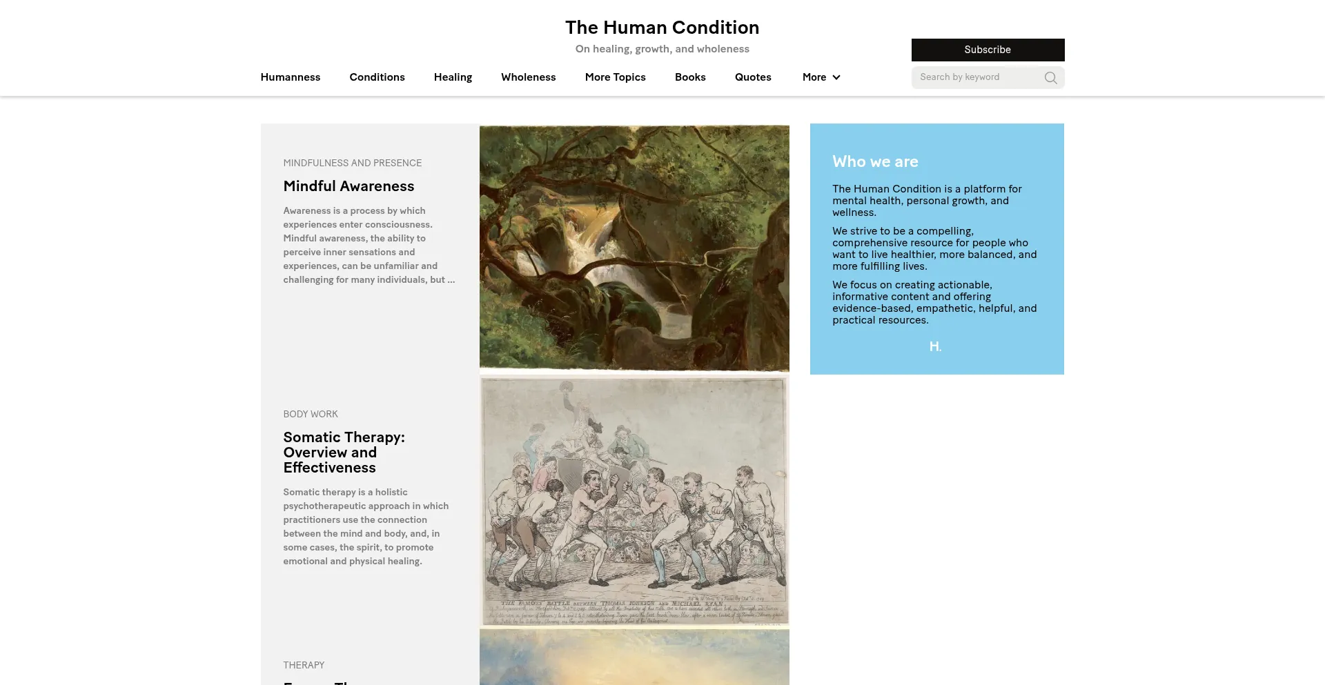 The Human Condition is a platform for mental health, personal growth, and wellness that emphasizes evidence-based and empathetic content, tools, and resources.