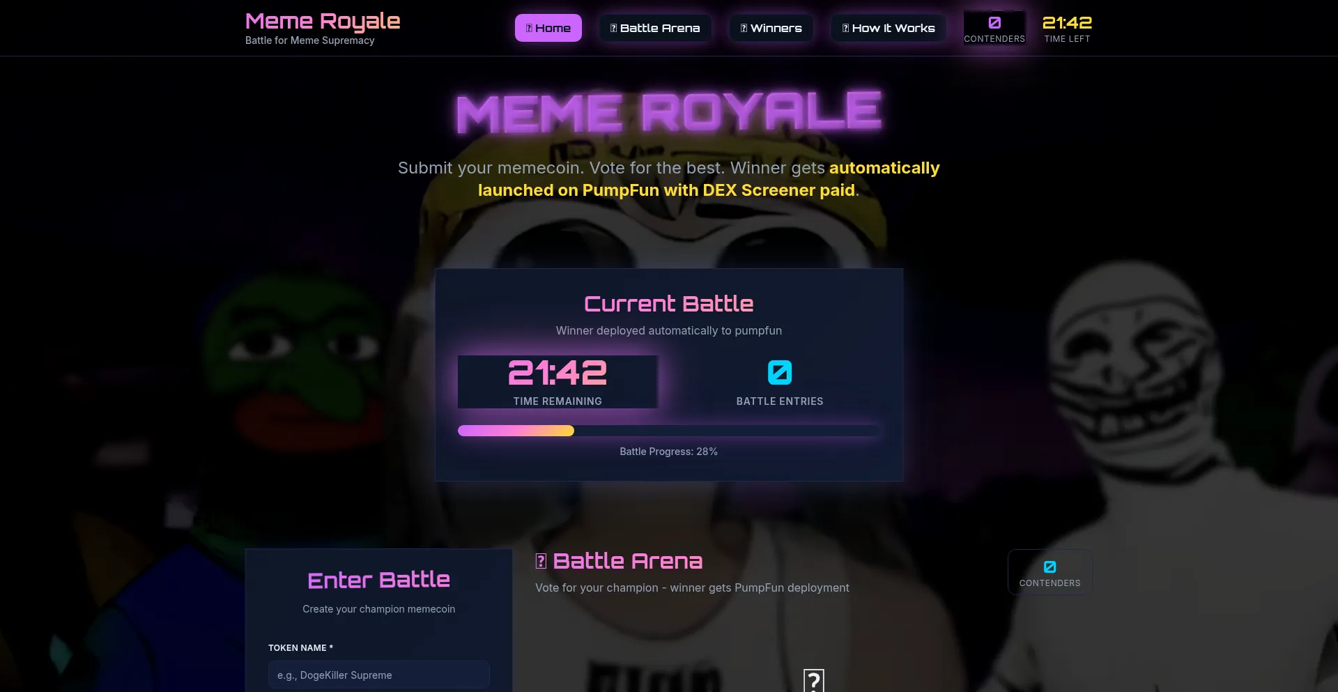 The ultimate meme coin battle platform. Submit your memes, vote for favorites, and watch winners deploy automatically to PumpFun mainnet!