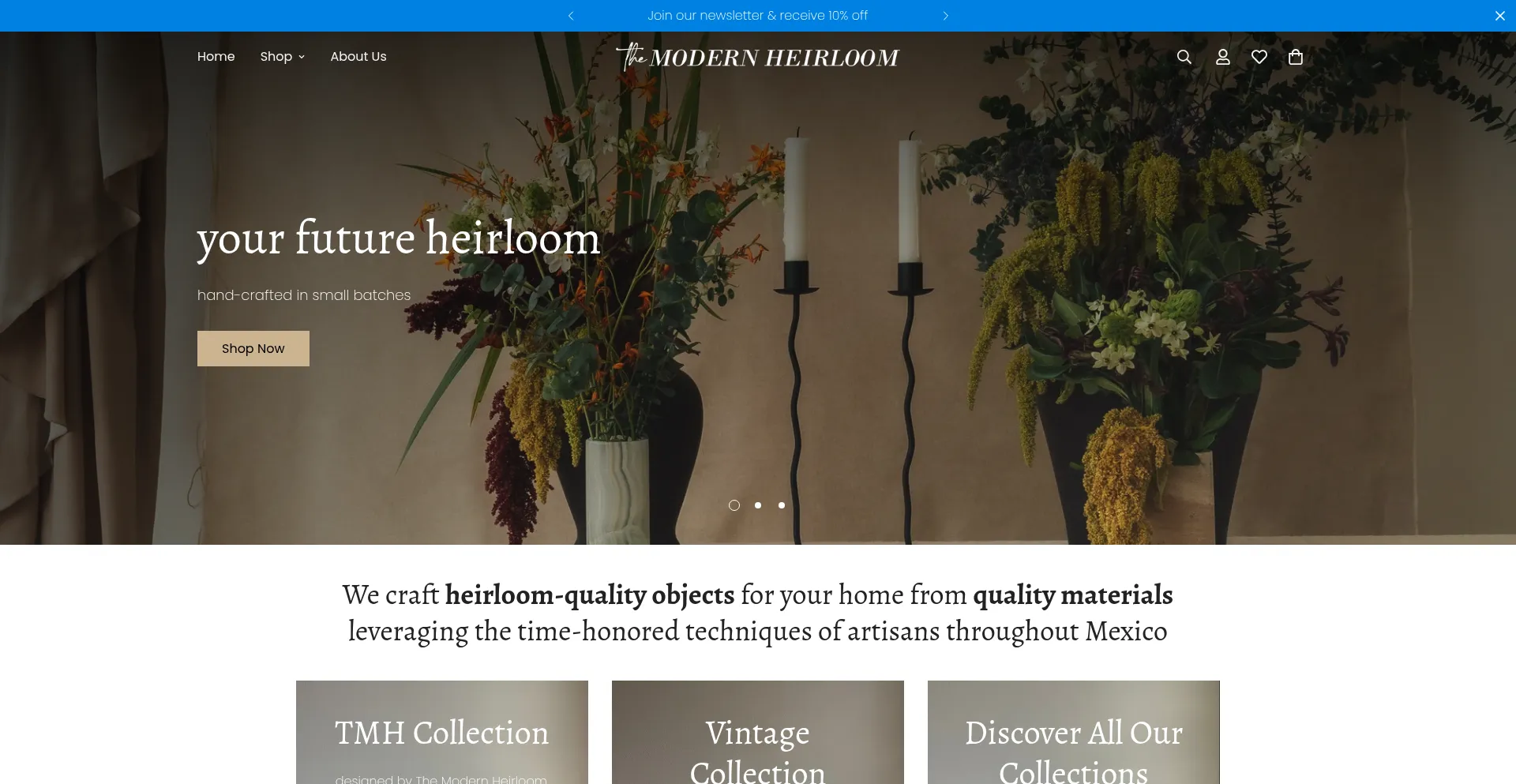 Our analyzer determines that website themodernheirloom.shop is using Shopify CMS. Shopify is a popular e-commerce platform, powering around 4.4% of websites globally.