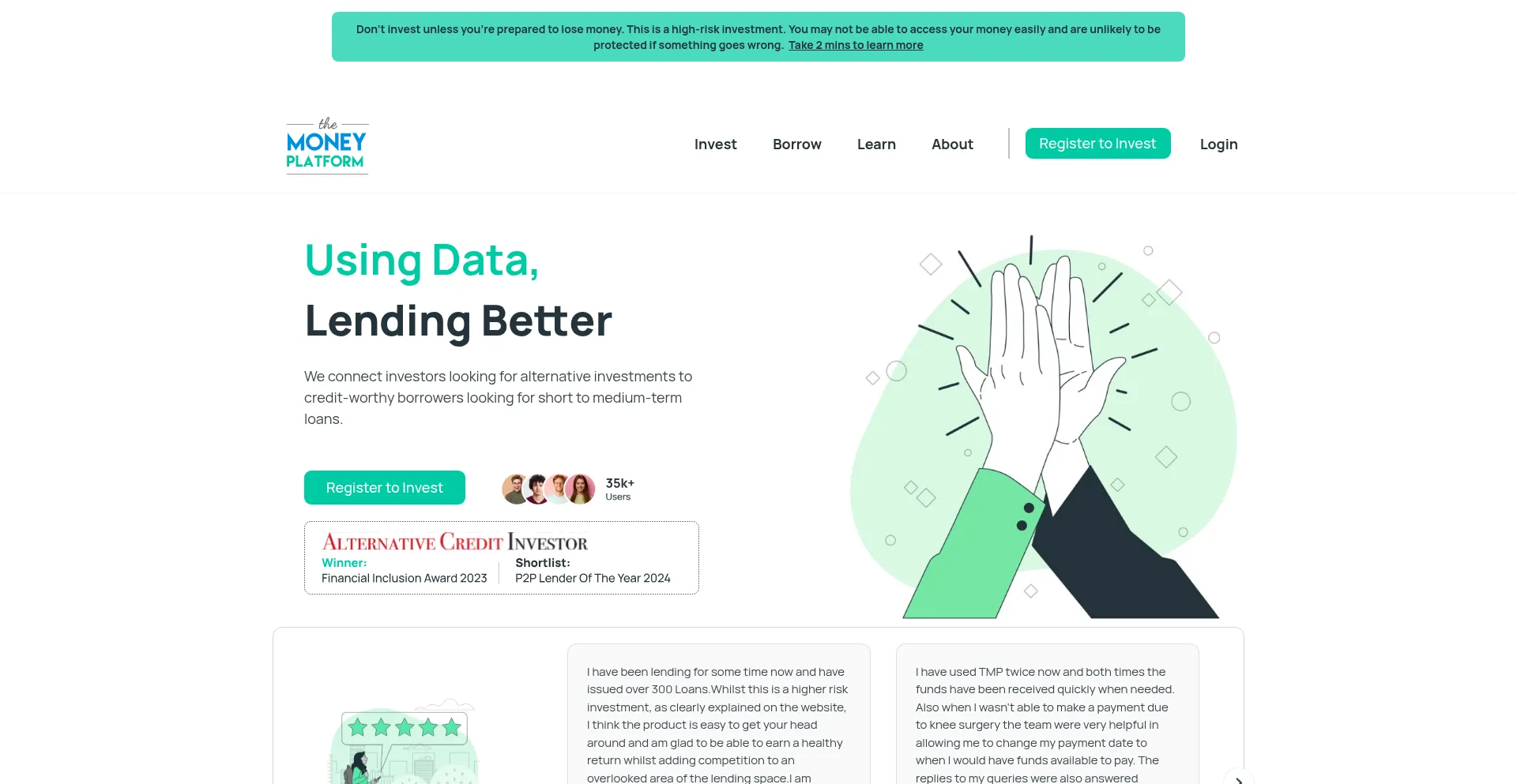 The Money Platform connects investors seeking alternative investments with creditworthy UK borrowers in need of short to medium-term personal loans.