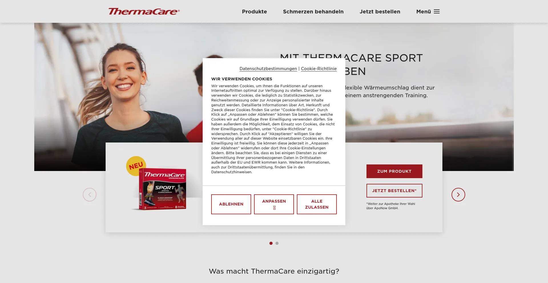 The thermacare.de website uses Google Tag Manager to add and update tracking tags on its website.
