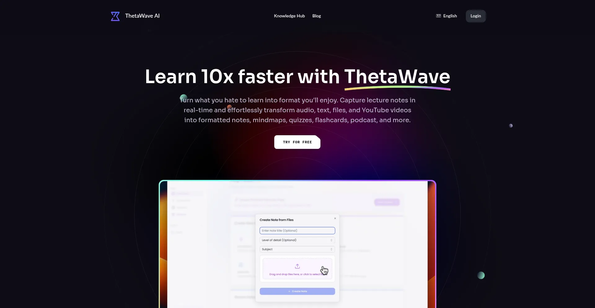 Never miss a word in lectures! Thetawave converts audio, text, files, and YouTube videos into beautifully formatted notes with customized levels of details. Learn faster from va...
