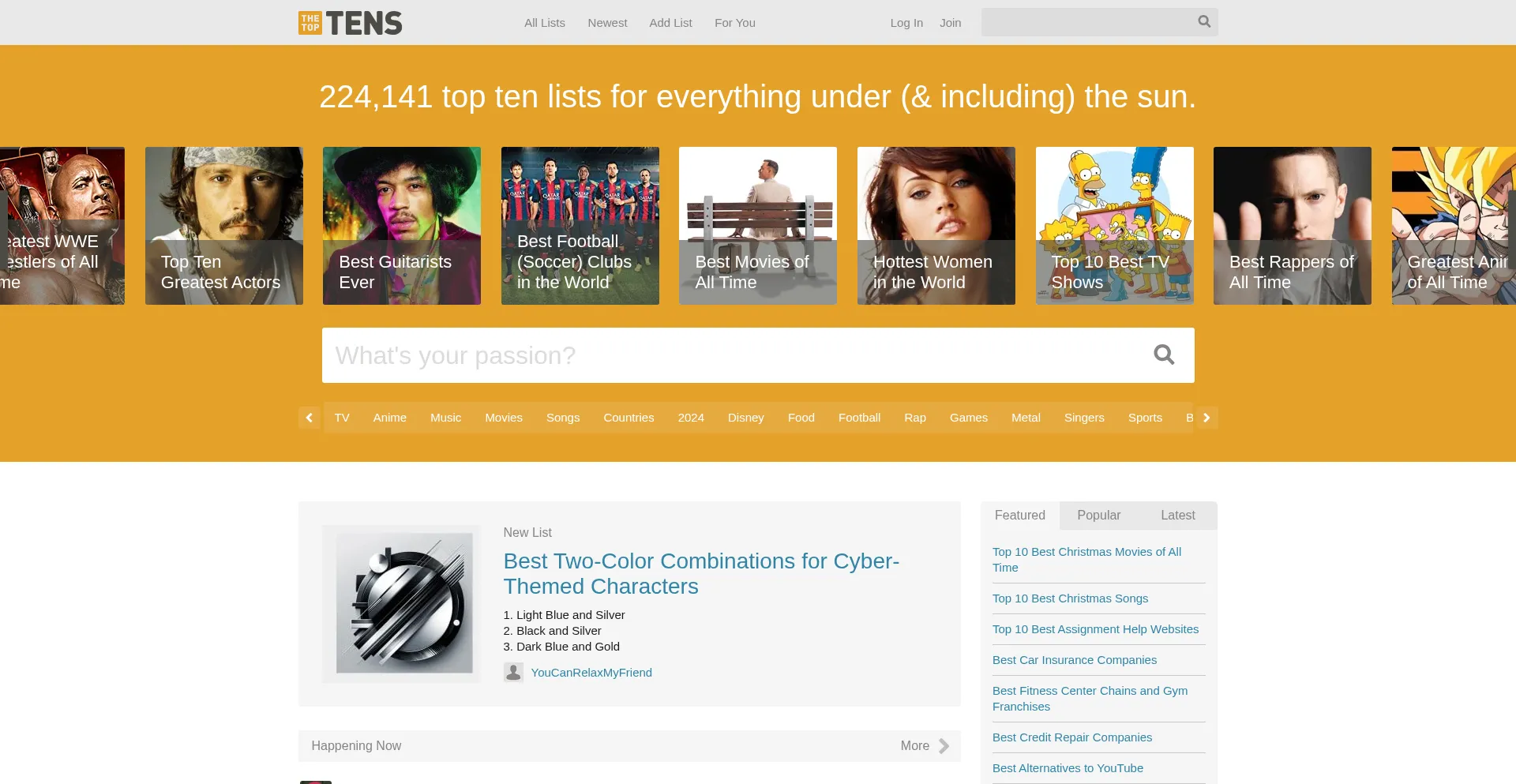 Vote on TheTopTens® 200,000+ lists or create a list of your own. You help determine the best video games, greatest songs, hottest celebs, top companies, and more.