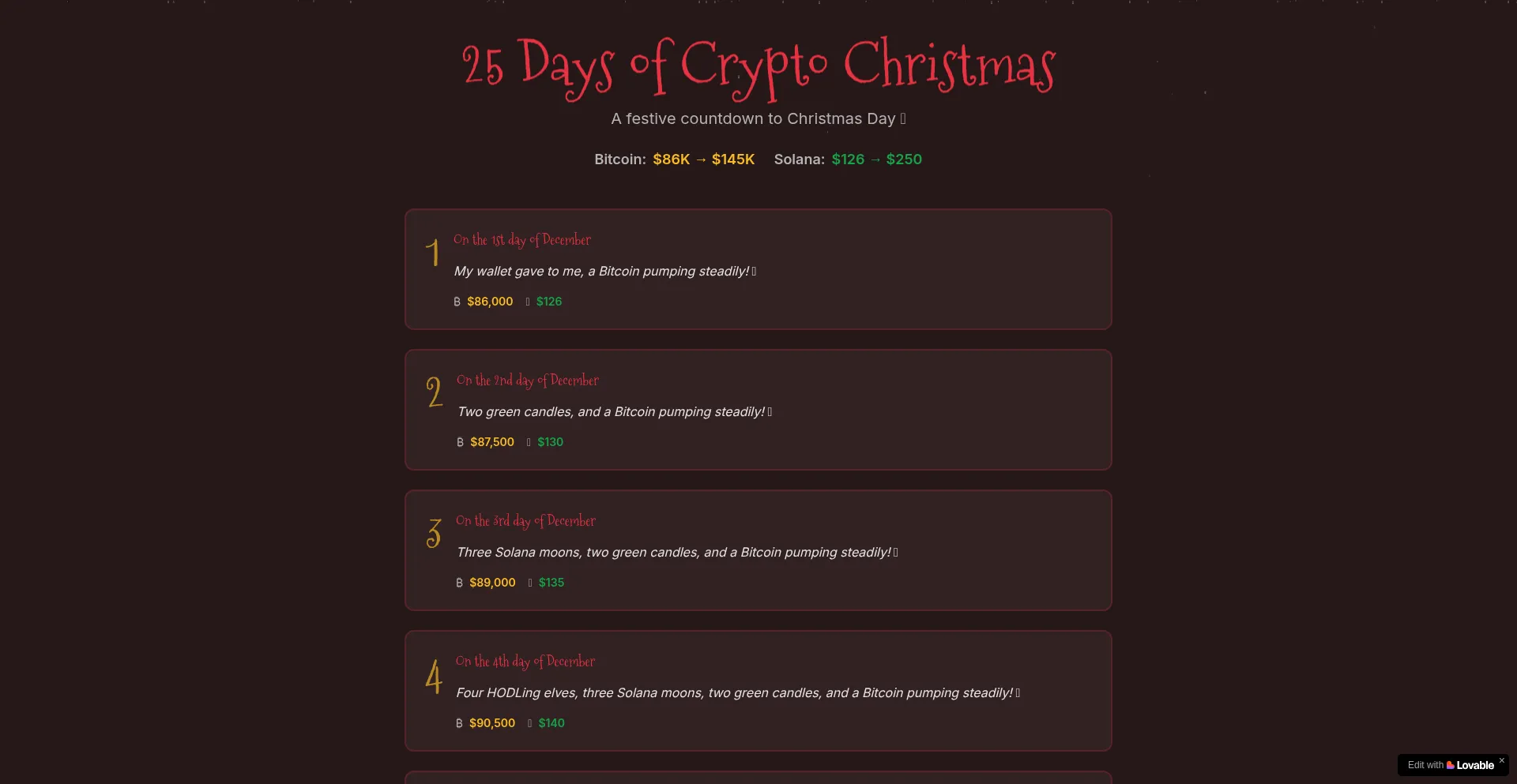 The thirtydaysofchristmas.lovable.app website references cryptocurrency transactions or educational content related to digital assets such as Bitcoin, Ethereum, or other blockchain-based currencies. Users should exercise caution as cryptocurrency transactions are irreversible and the decentralized nature of these assets provides limited recourse for fraudulent activities.