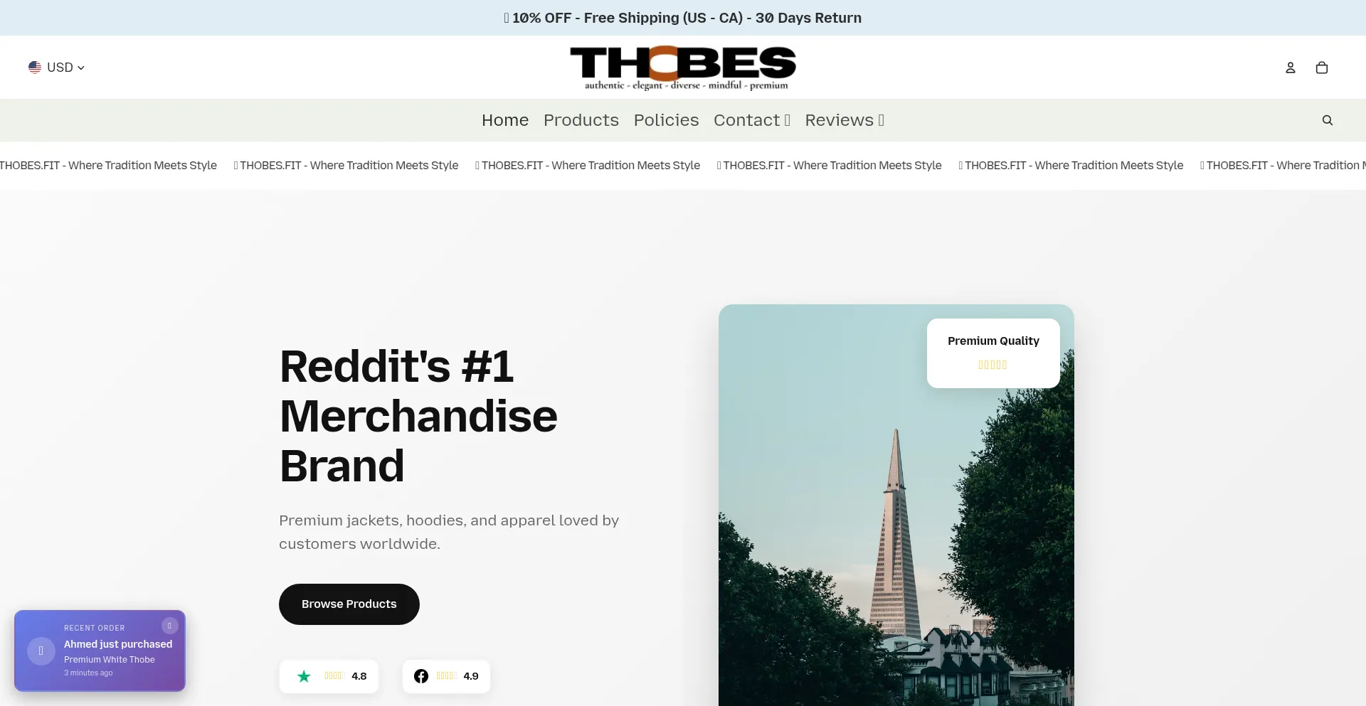 Our analyzer determines that website thobes.fit is using Shopify CMS. Shopify is a popular e-commerce platform, powering around 4.4% of websites globally.