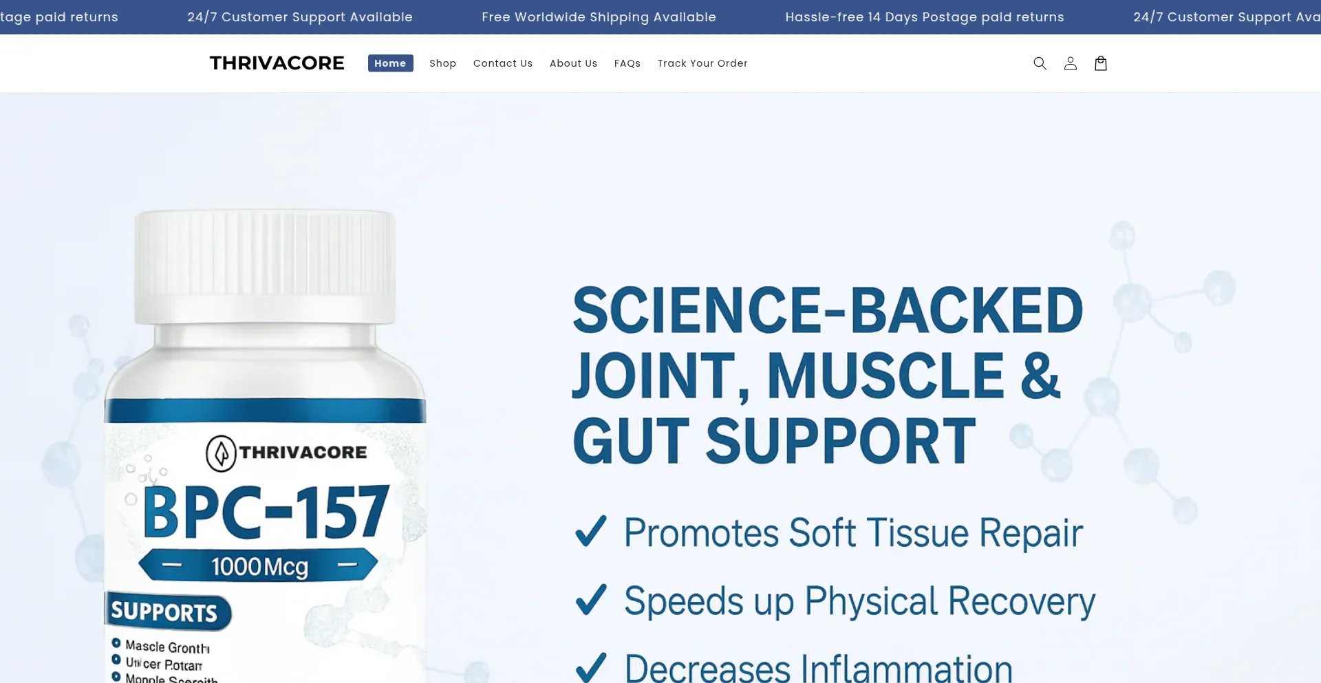 Analysis indicates that thrivacore.com operates as an e-commerce platform facilitating online transactions for goods or services. The website implements shopping cart functionality, payment processing systems, and product catalog features typical of commercial retail operations.