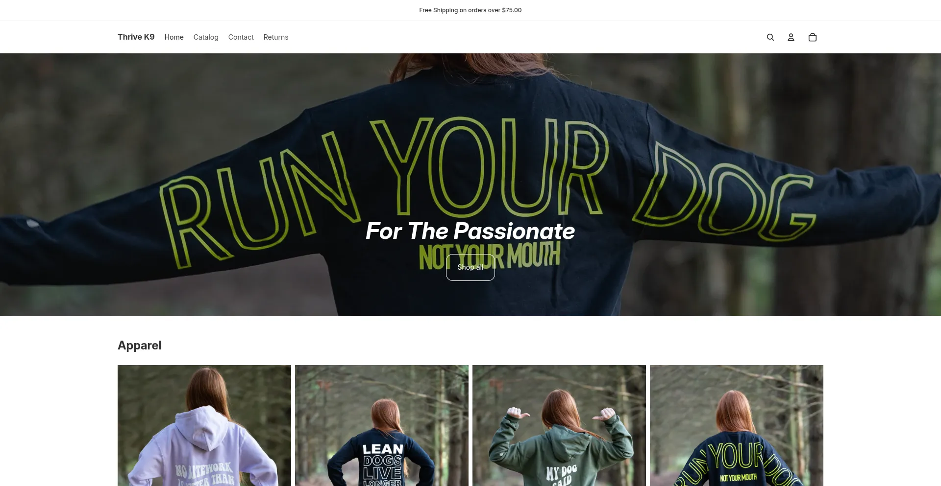 The thrivek9.com website utilizes free e-commerce platform solutions, which may indicate cost-conscious operations but could also suggest limitations in security features, customer support, or advanced functionality compared to enterprise-grade solutions.
