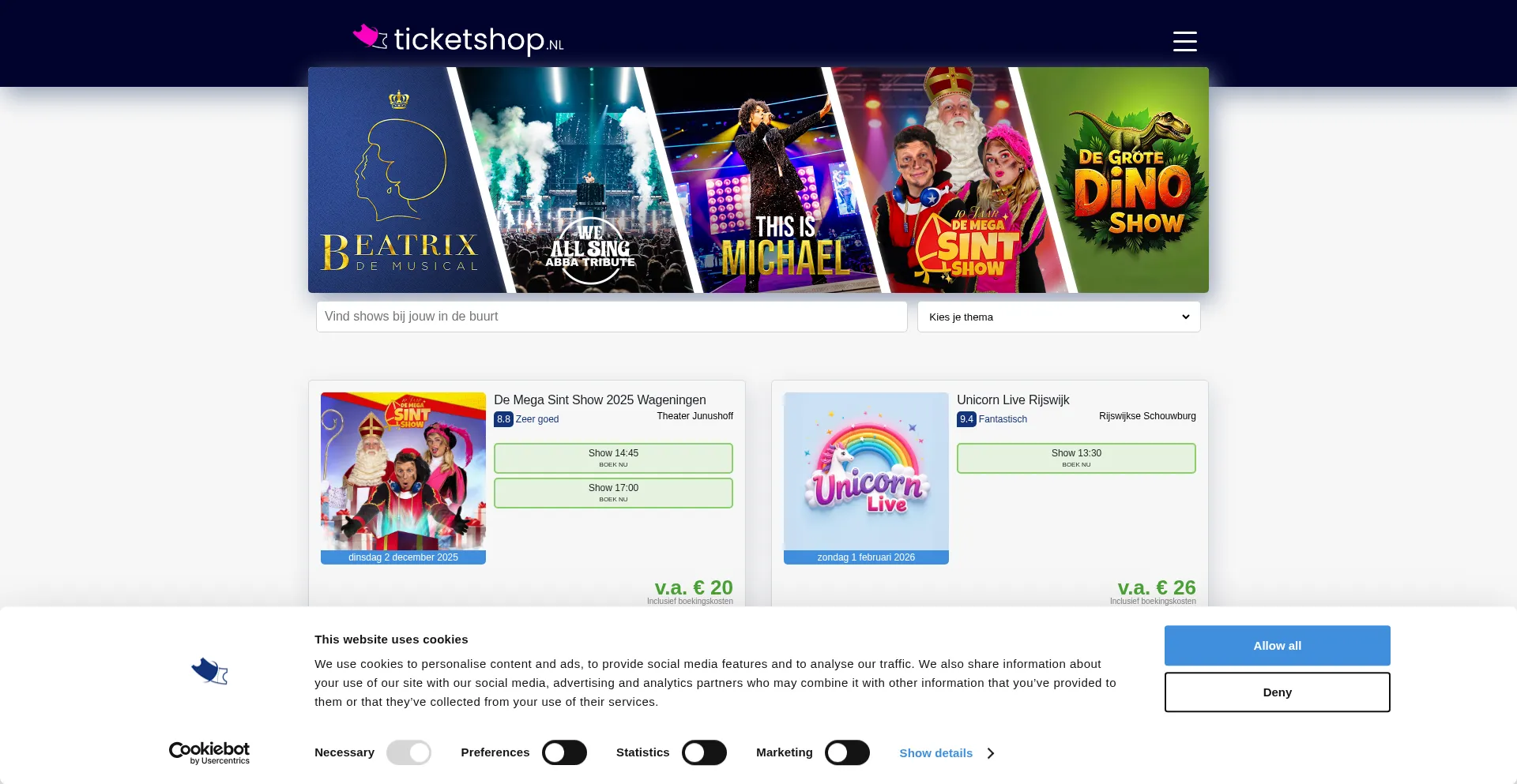 The website implements cookie consent mechanisms in compliance with privacy regulations such as GDPR or CCPA. This demonstrates that ticketshop.nl adheres to data protection standards and provides users with control over personal data collection practices.