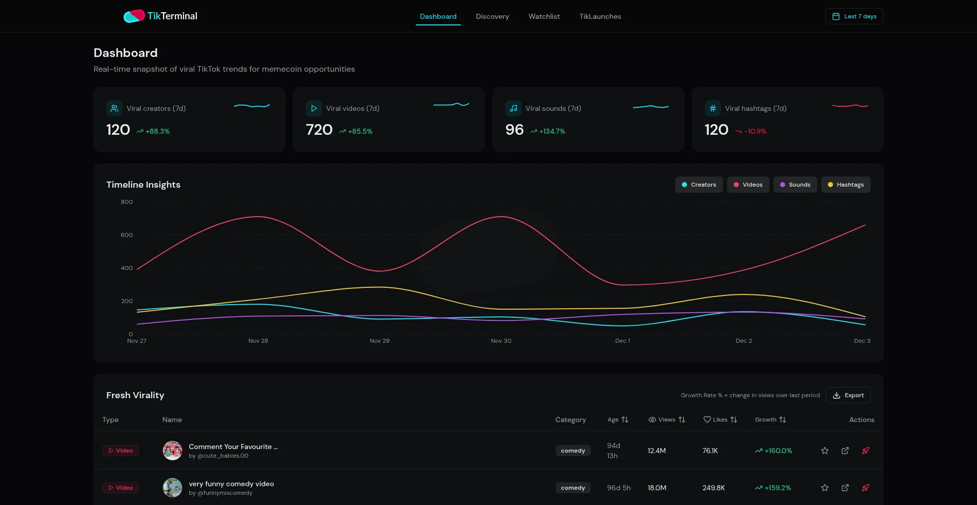 TikTerminal is a trend radar for crypto memecoin traders. Scan TikTok for newly trending creators, videos, sounds, and hashtags to spot fresh memes and launch tokens on pump.fun.