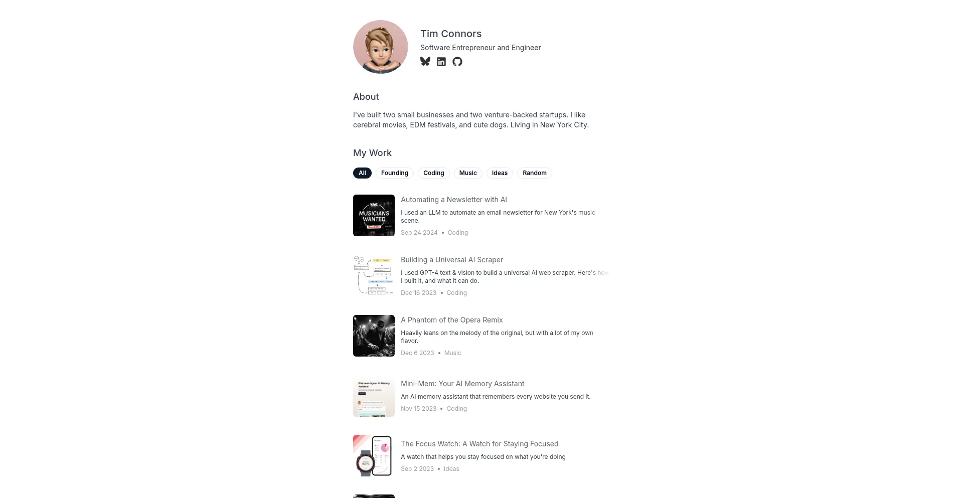 github.com x.com bsky.app minimem.ai timconnors.co soundcloud.com www.linkedin.com