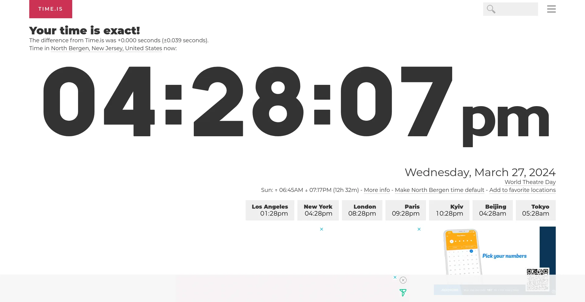 Time.is provides exact time, any time zone for 7 million locations in 57 languages, synchronized with atomic clock time.