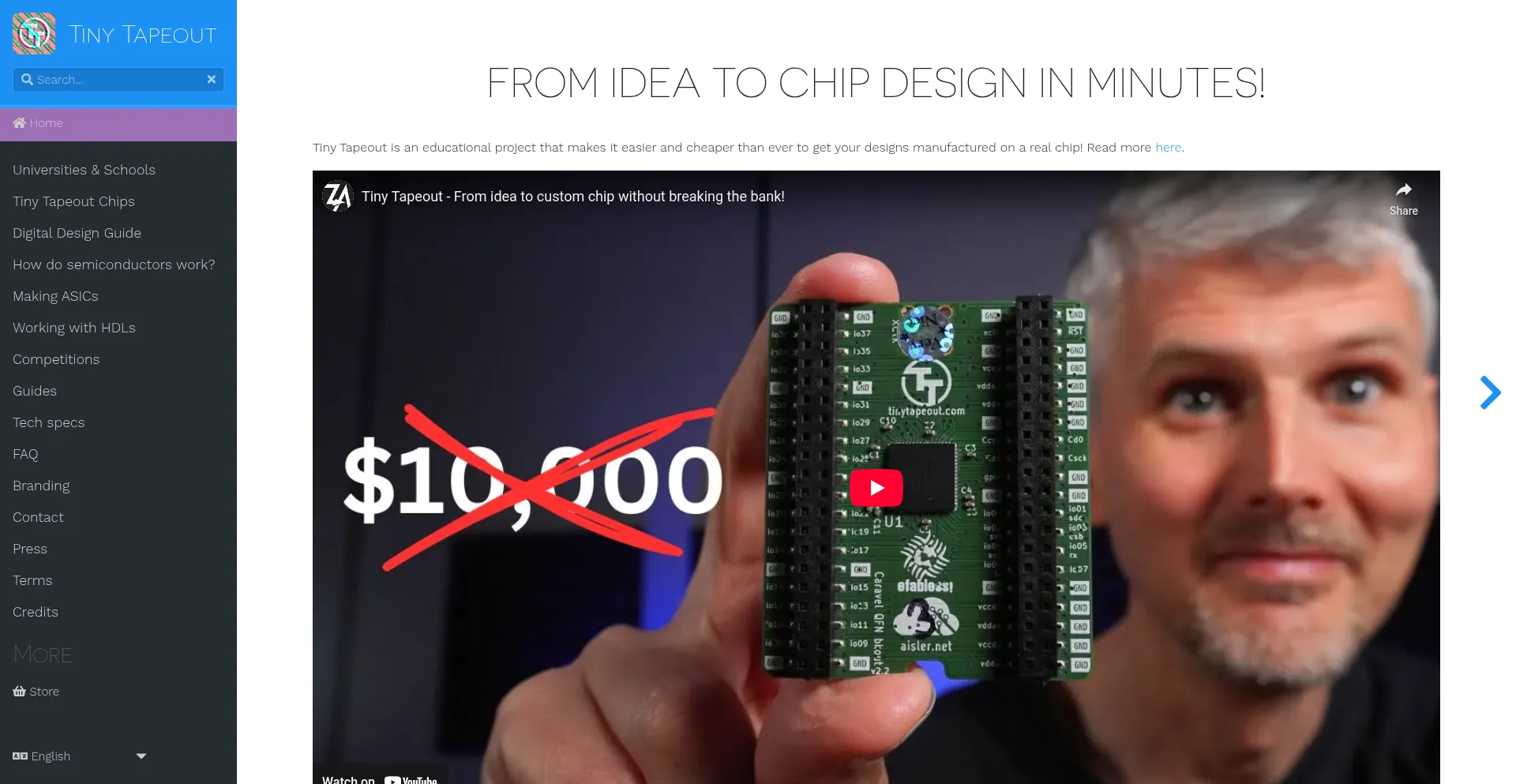 From idea to chip design in minutes! Tiny Tapeout is an educational project that makes it easier and cheaper than ever to get your designs manufactured on a real chip.