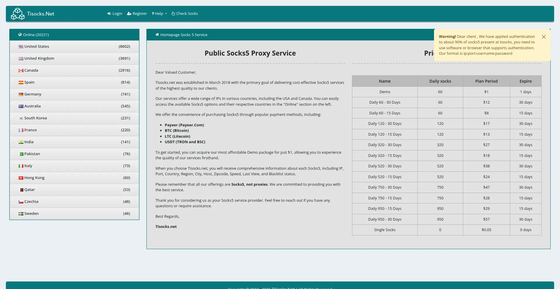 Our company tisocks.net is offering public SOCKS Proxy Service. Buy SOCKS proxy in our shop in affordable prices. We auto accept BitCoin, PerfectMoney payments and Wmtransfer. V...
