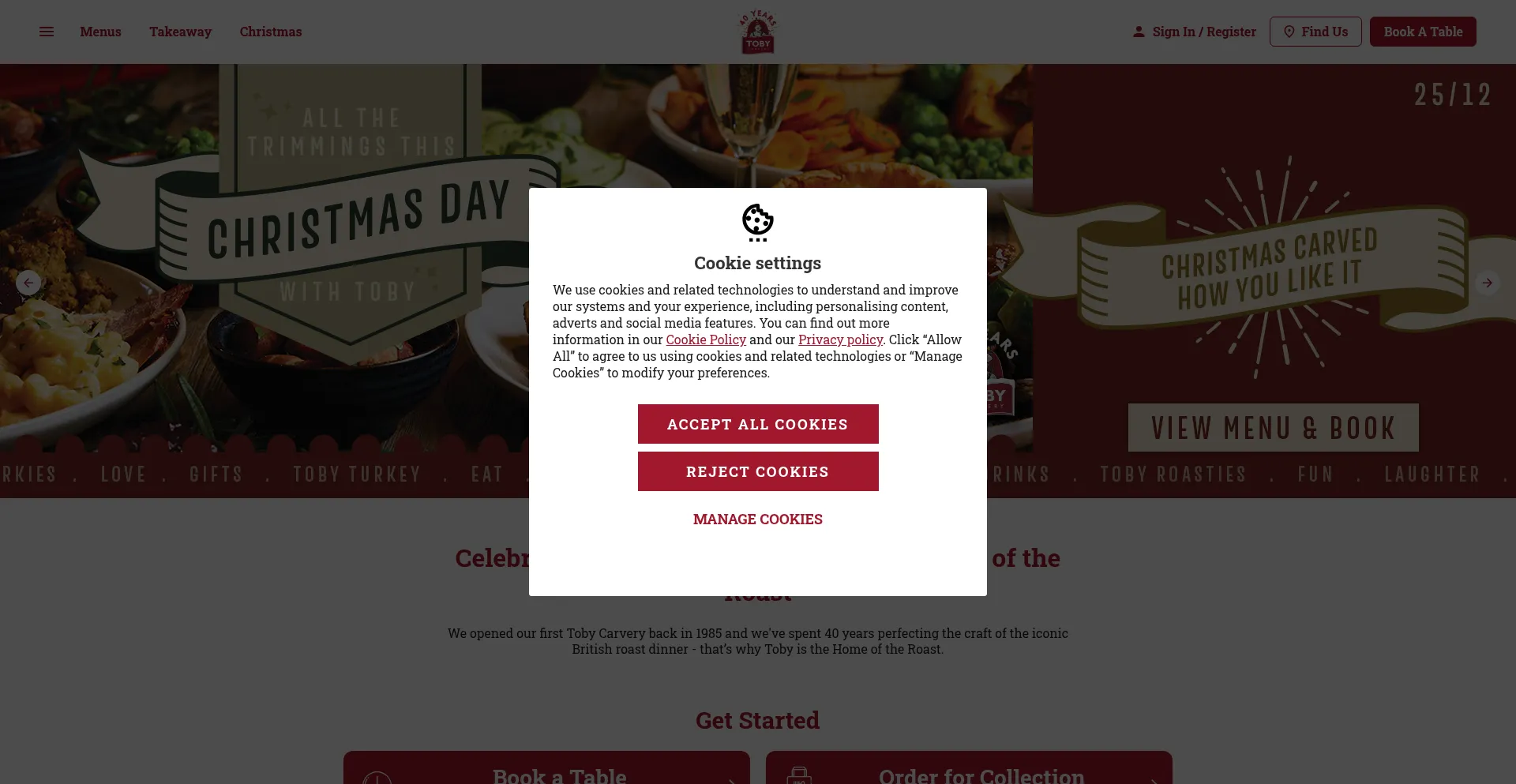 The website implements cookie consent mechanisms in compliance with privacy regulations such as GDPR or CCPA. This demonstrates that tobycarvery.co.uk adheres to data protection standards and provides users with control over personal data collection practices.