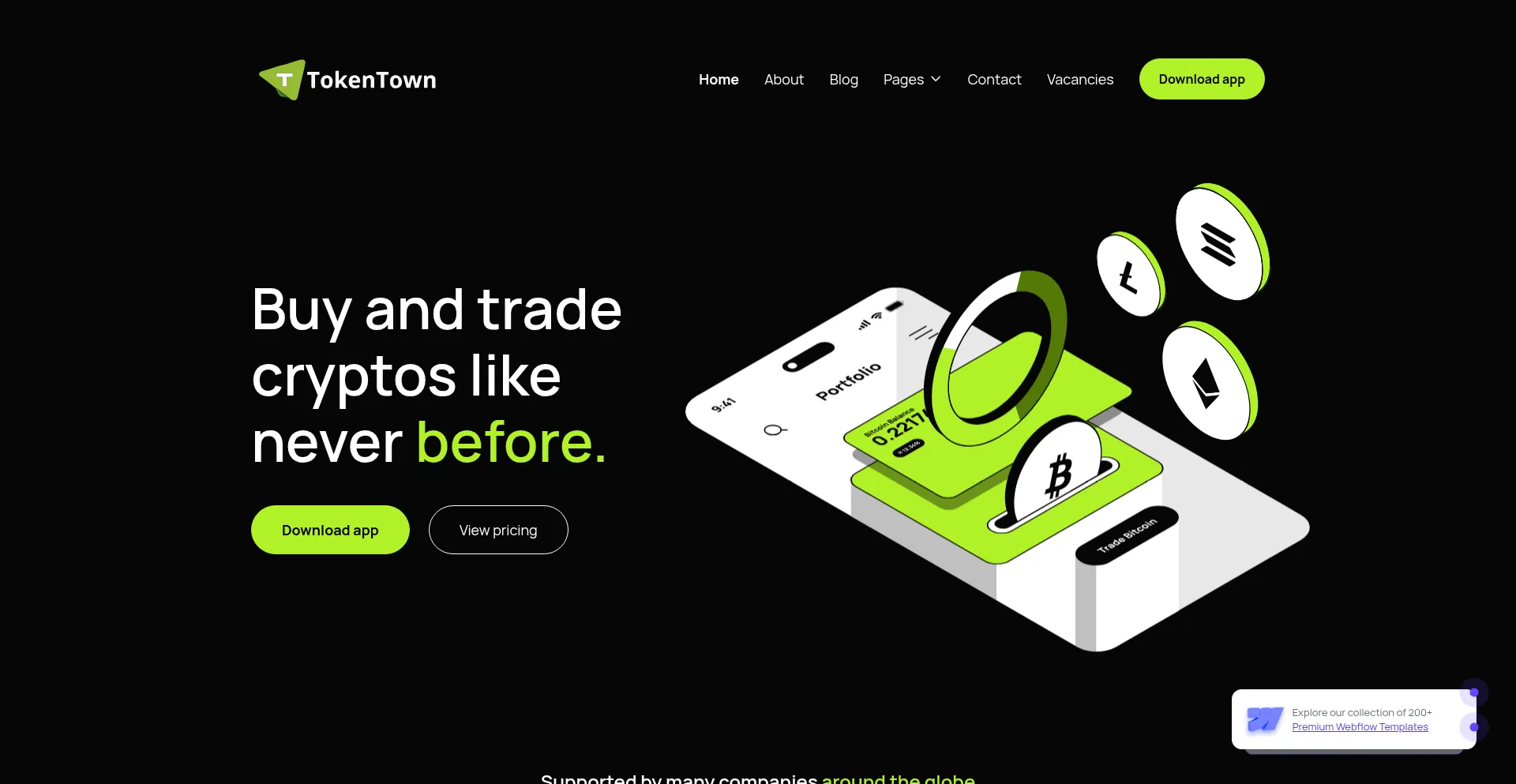 Get TokenTown - Fintech Webflow Template and build a sleek website for your finance startup with our easy-to-use template for the Crypto, DeFi, and Blockchain industries.