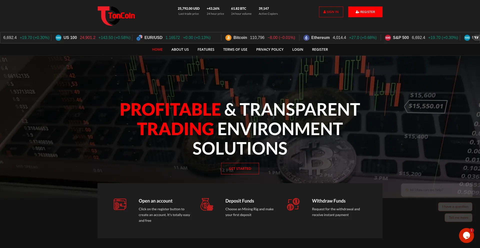 The toncoin-trade.com probably offers cloud mining services or cryptocurrency mining investments. Some platforms provide legitimate mining rental services, while others may use fake mining dashboards to display virtual earnings that cannot be withdrawn.
