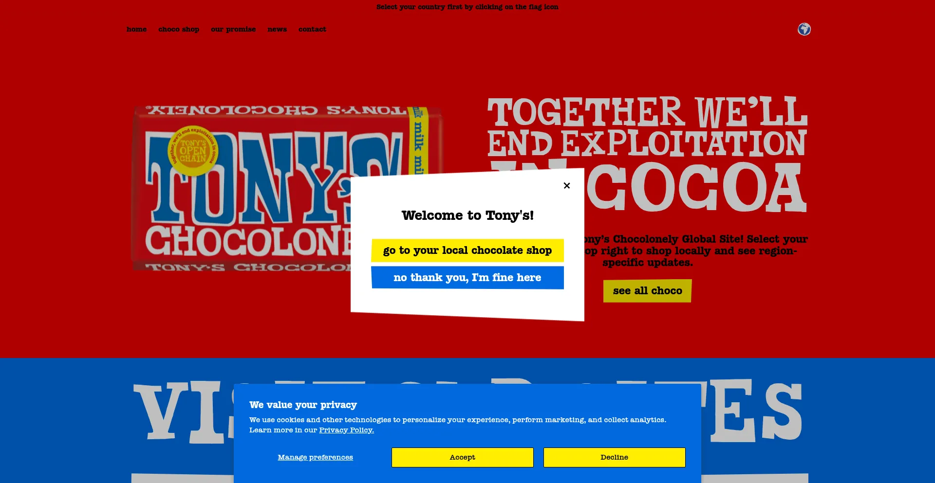 The website implements cookie consent mechanisms in compliance with privacy regulations such as GDPR or CCPA. This demonstrates that tonyschocolonely.com adheres to data protection standards and provides users with control over personal data collection practices.