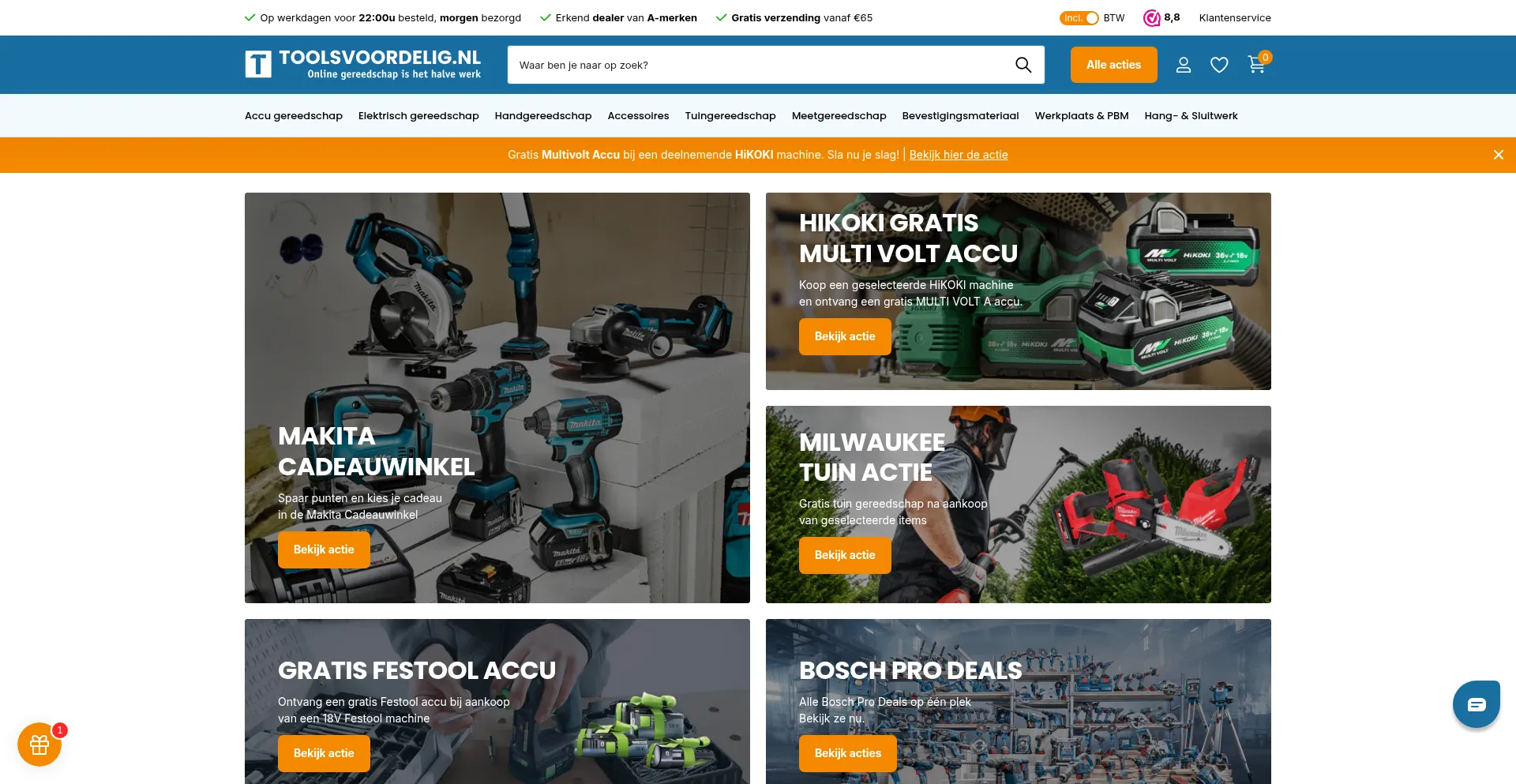 Professioneel gereedschap voor iedere klus. Topmerken als: Makita, Bosch, DeWALT en Festool. ✓Altijd voordelig ✓Voor 22:00 uur besteld, morgen in huis ✓Veilig betalen