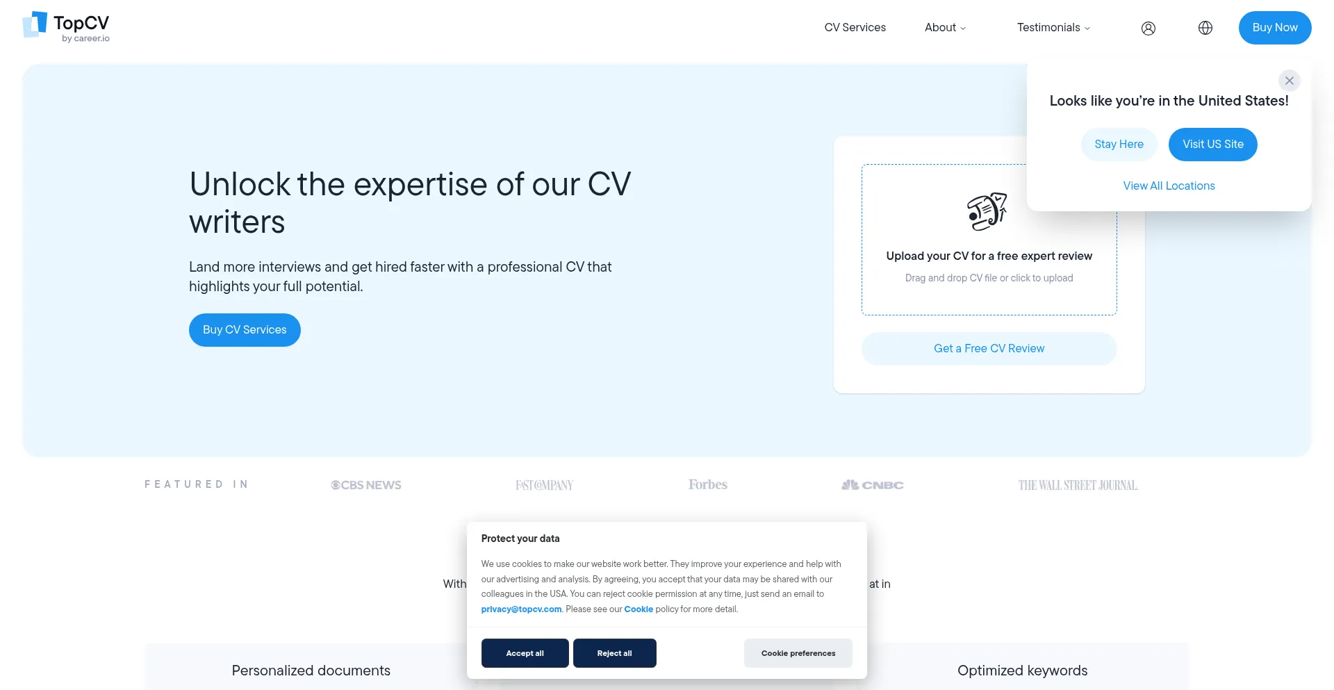The topcv.com website implements data collection forms requesting personal information including names, email addresses, phone numbers, or other sensitive details. Users should verify the legitimacy of it and review privacy policies before submitting personal data.