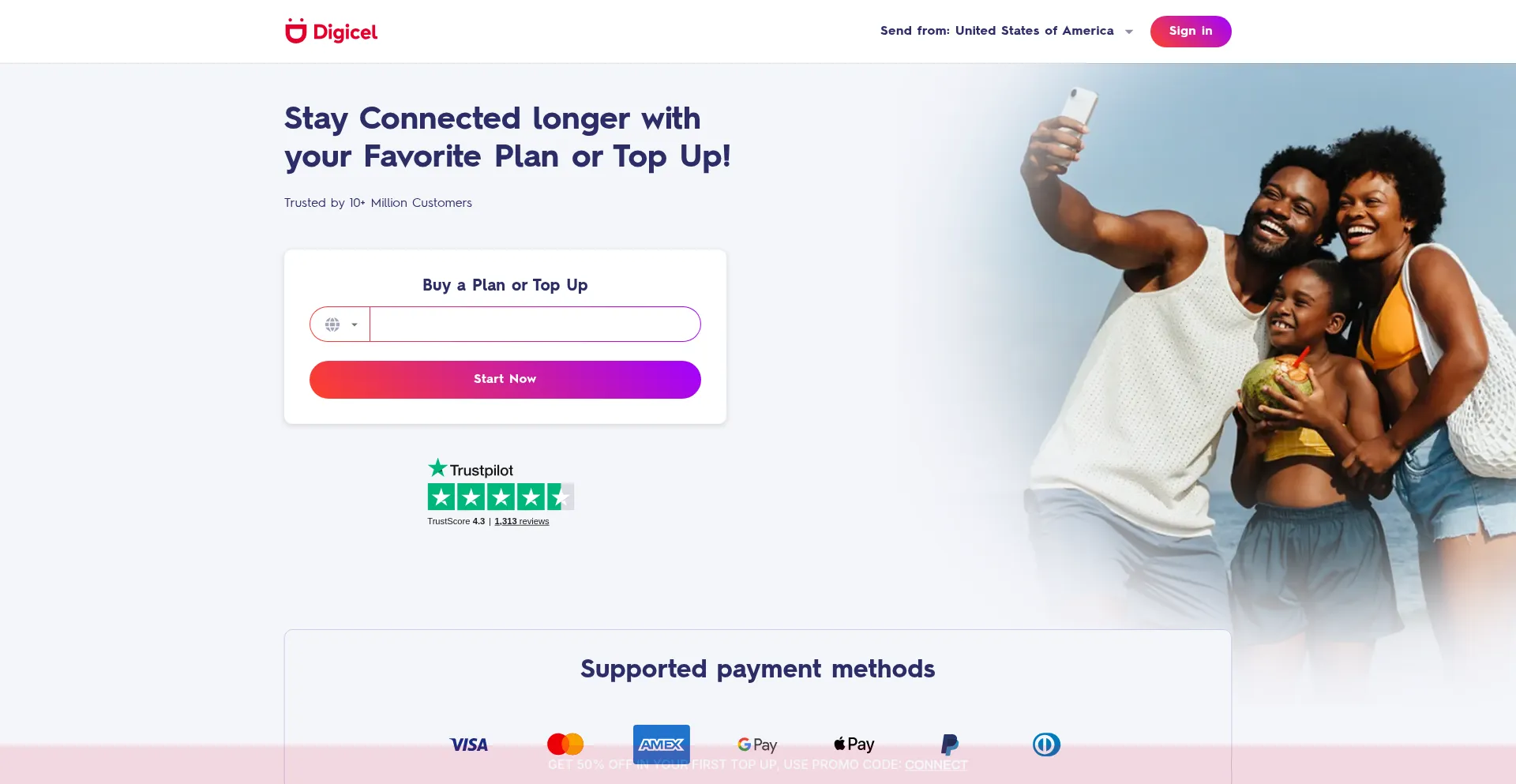 topup.digicelgroup.com has a good Trustpilot score (4.3) based on 1313 reviews, indicating a high level of trust from customers. It is a good sign of legitimacy!