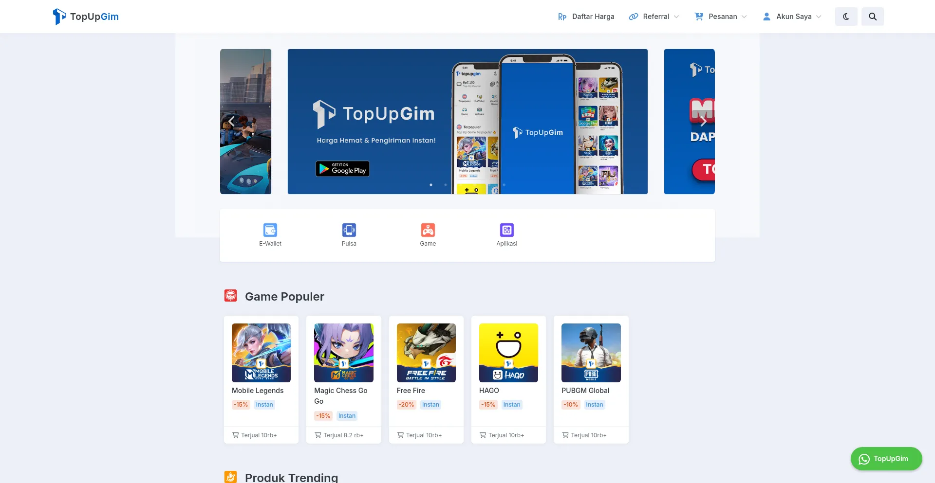 TopUpGim adalah situs Top Up Game resmi dengan harga termurah. Top Up Game Mobile Legends, Free Fire, Honor of Kings, dan ratusan game lainnya lebih hemat di TopUpGim!