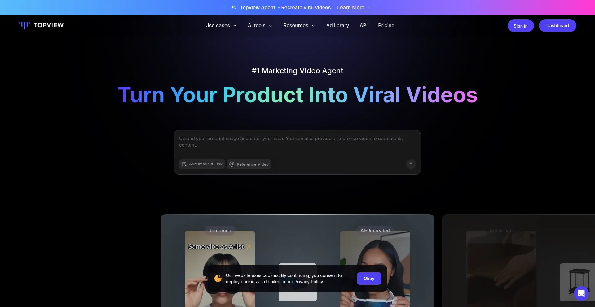 Topview turns any product into viral videos. Simply upload a product image and a reference video — or choose one from Topview’s 10M Viral Video Library. Topview Agent recrea...
