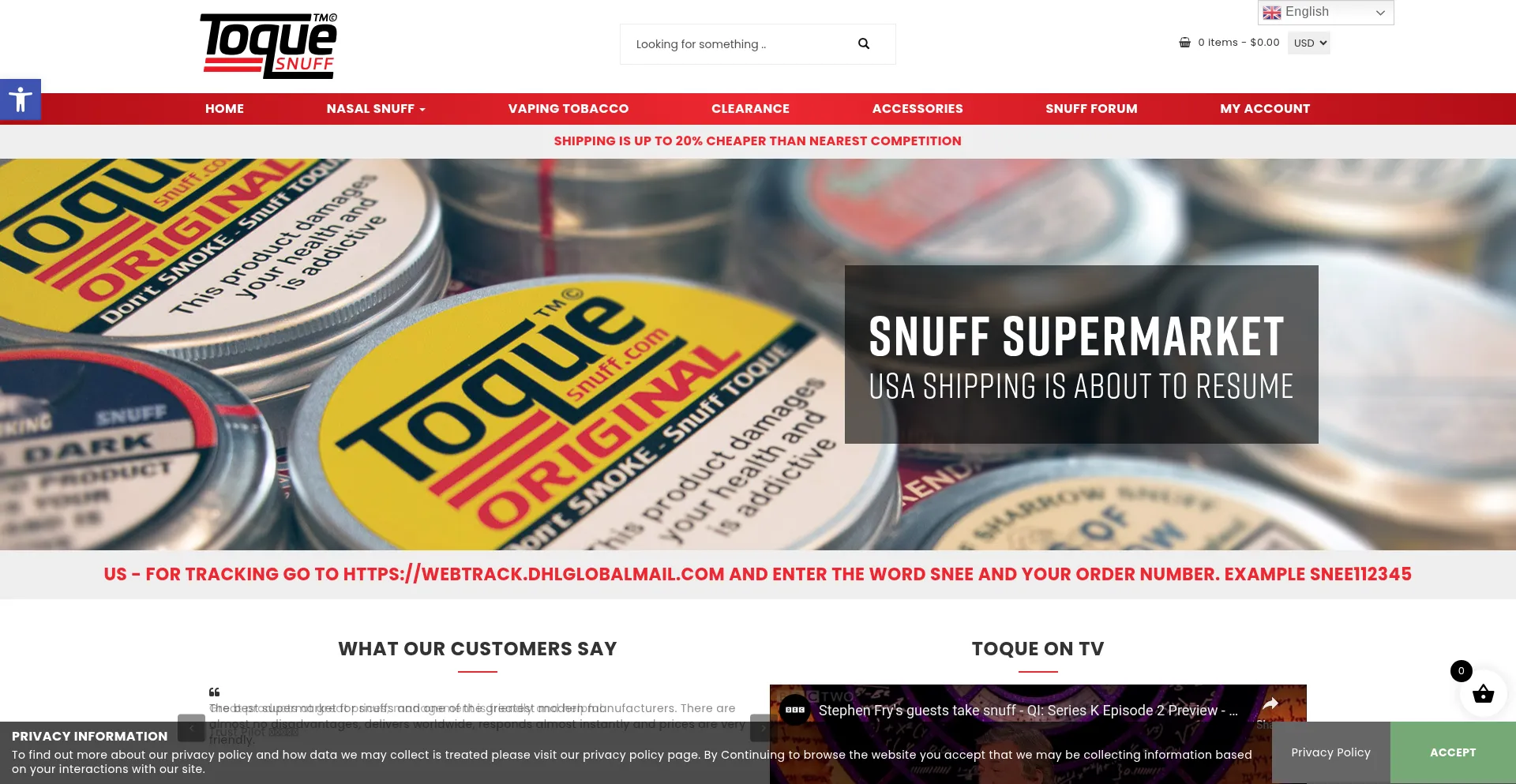 Analysis indicates that toquesnuff.com operates as an e-commerce platform facilitating online transactions for goods or services. The website implements shopping cart functionality, payment processing systems, and product catalog features typical of commercial retail operations.