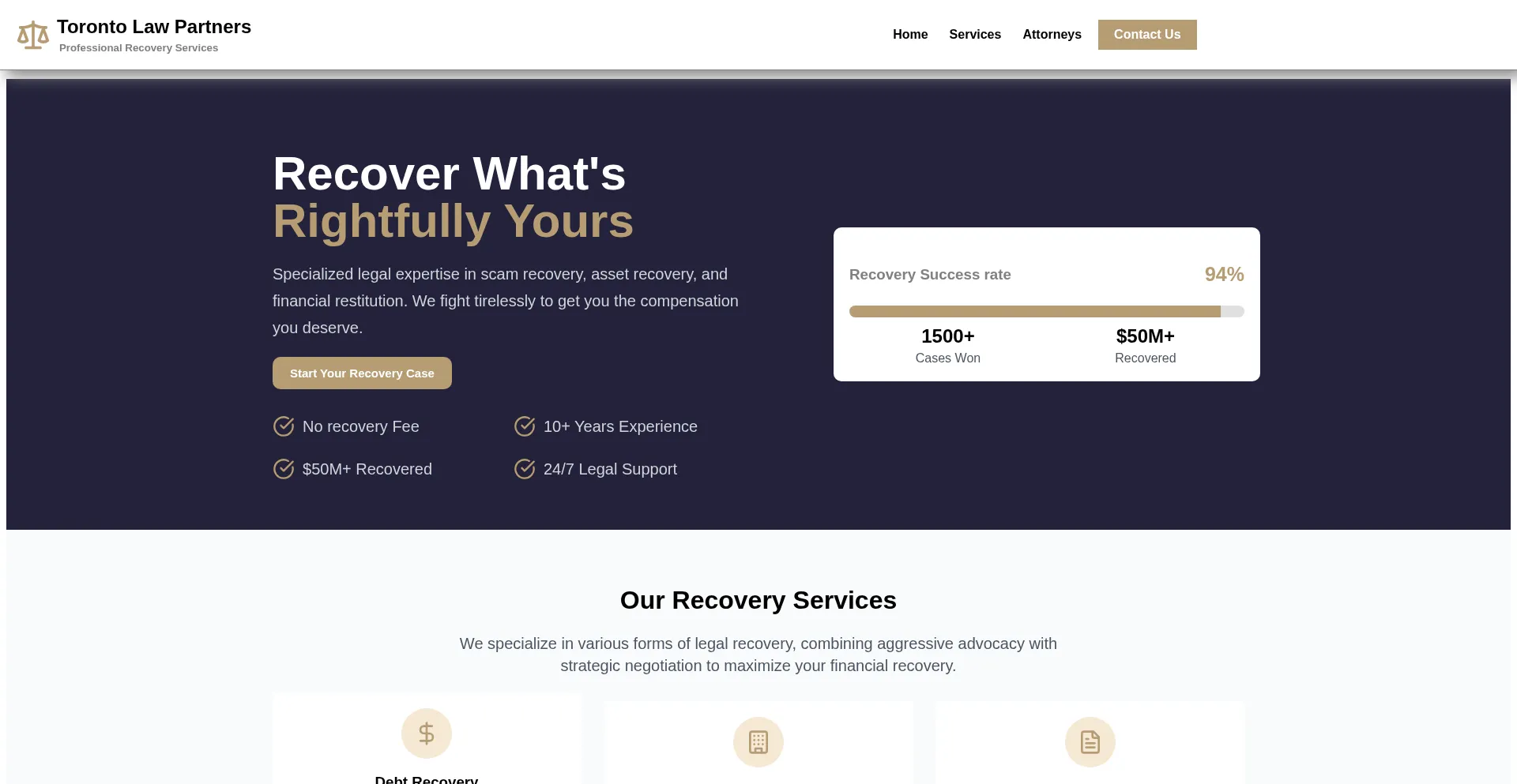 The website torontolawpartners.ca advertises fund recovery services for lost or stolen assets. While some operate on contingency fee structures, others may require upfront payments, which can indicate fraudulent operations. Verify credentials and regulatory compliance before engaging such services.