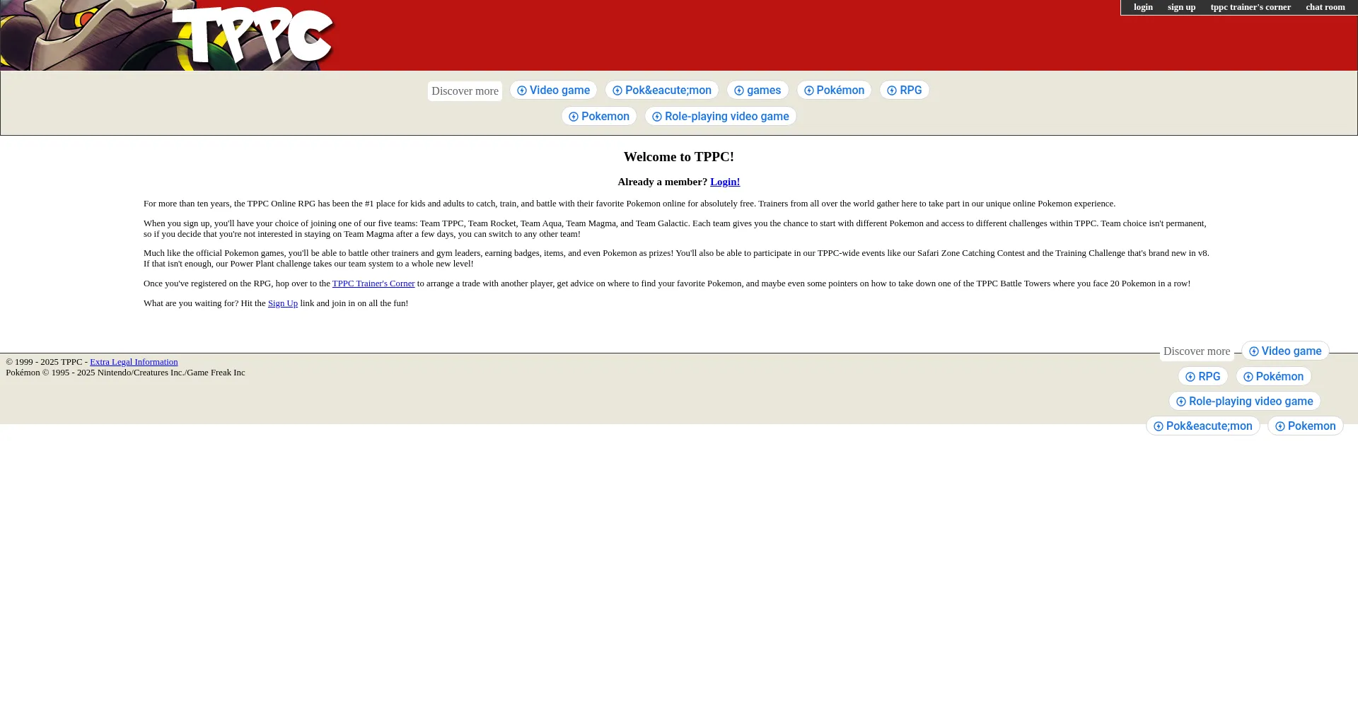For more than ten years, the TPPC Online RPG has been the #1 place for kids and adults to catch, train, and battle with their favorite Pokemon online for absolutely free.