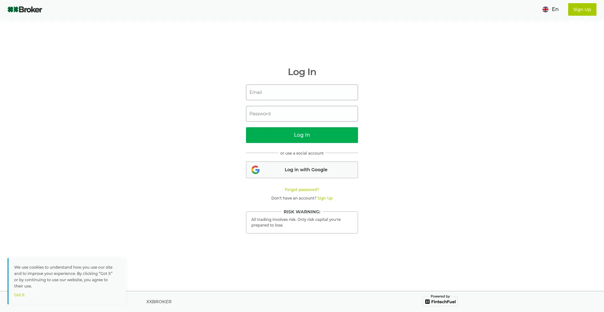 XXBROKER login form. Also, you can use your Facebook or Google account to log in.