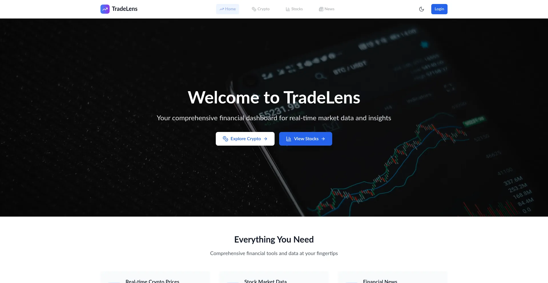 TradeLens - Your comprehensive financial dashboard for real-time cryptocurrency prices, stock market updates, and financial news.