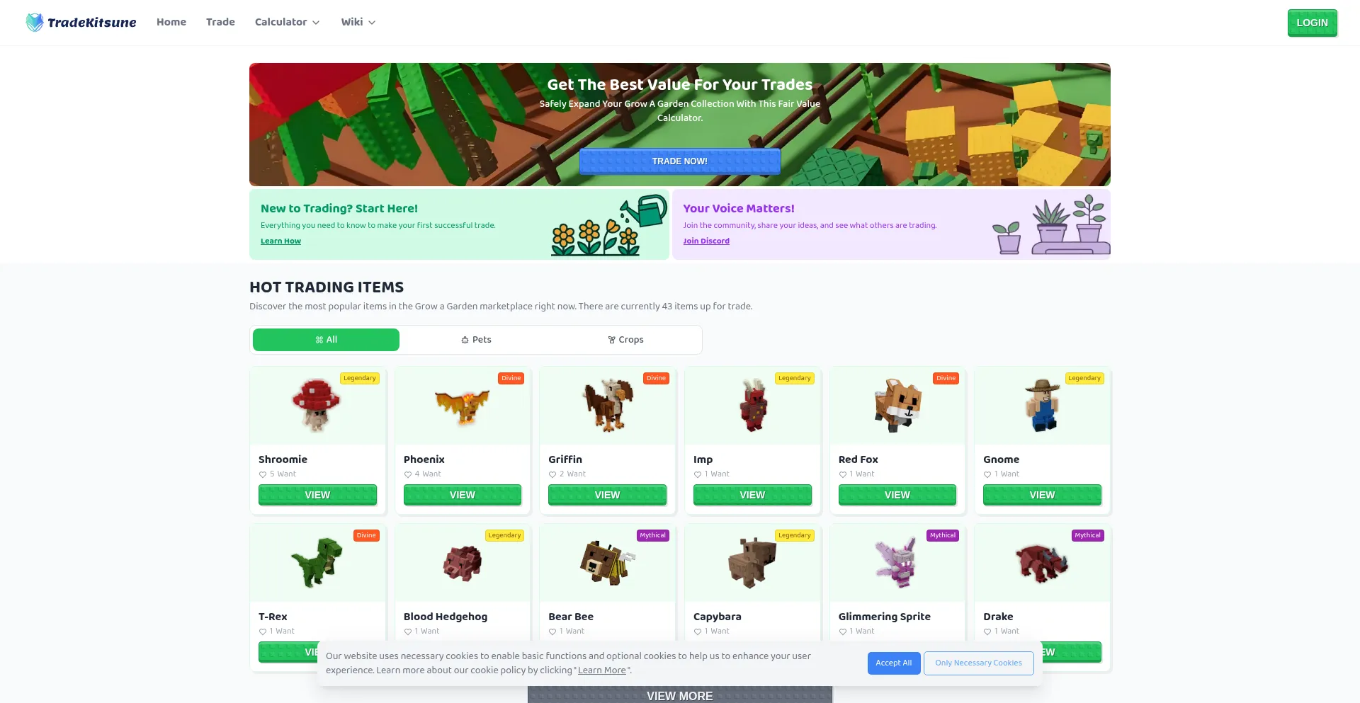 Calculate Roblox Grow a Garden (GAG) crop and pet values, and trade GAG items on TradeKitsune - the fast, reliable GAG calculator and trading marketplace.