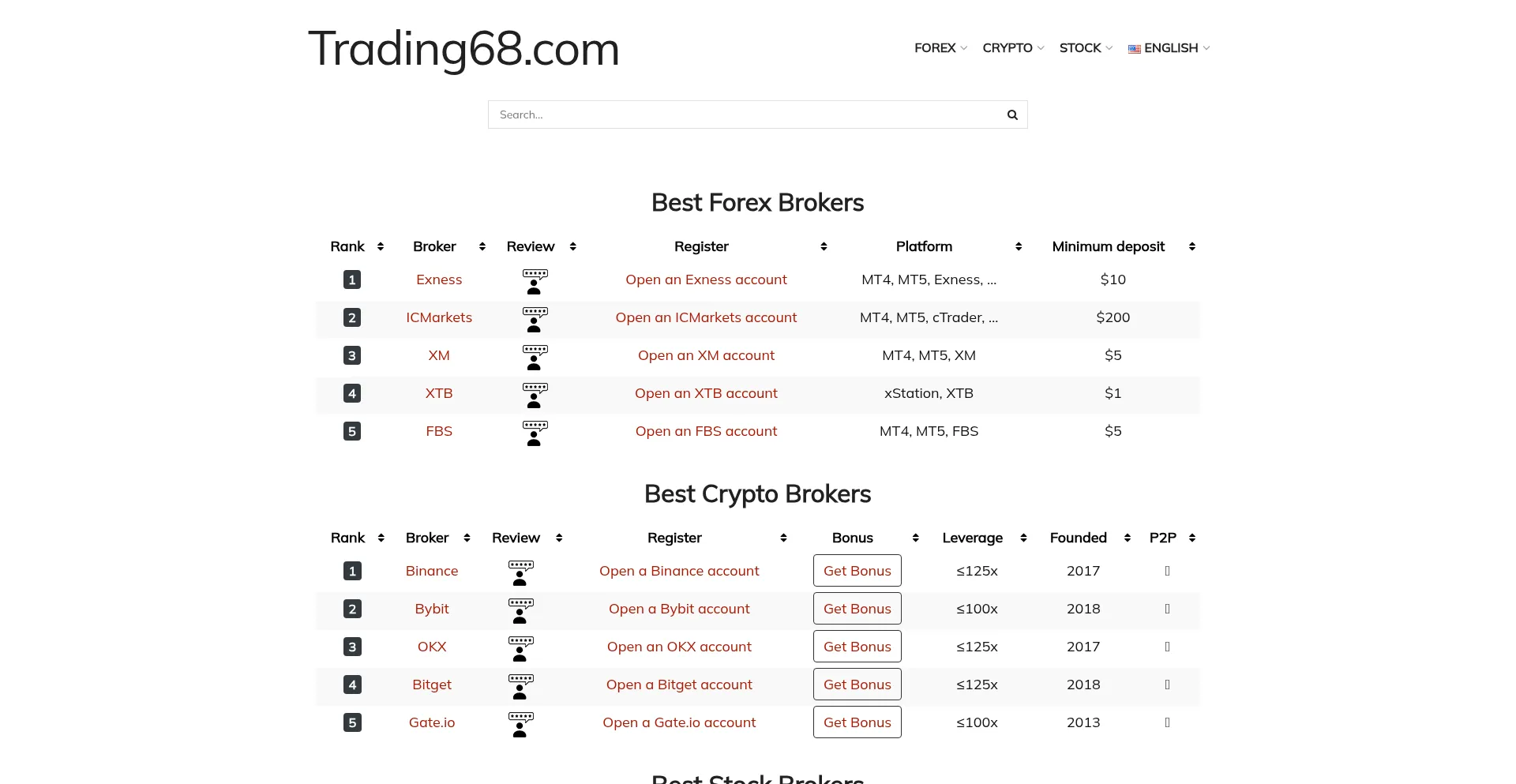 Trading68.com - Update rankings of forex, crypto and stock exchanges