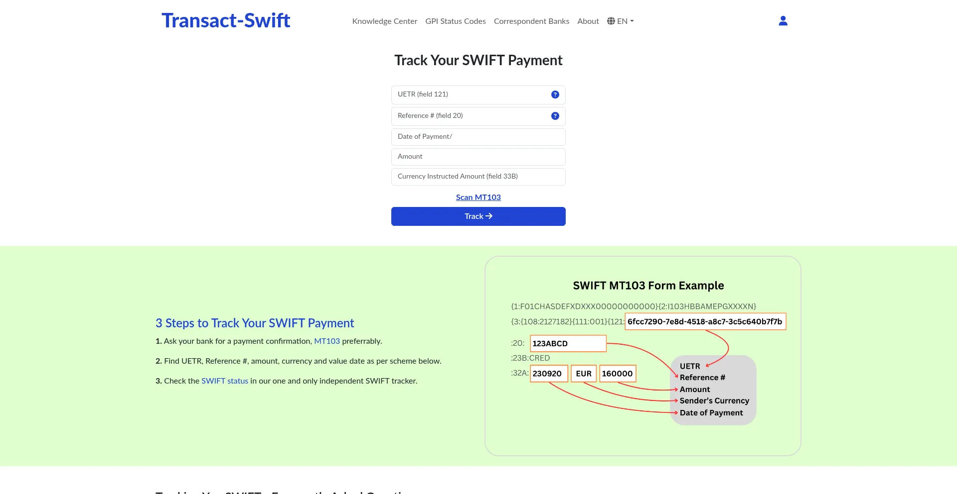 SWIFT basic tracking of your wire transfer and GPI status in certain banks. Use UETR or Sender's reference #